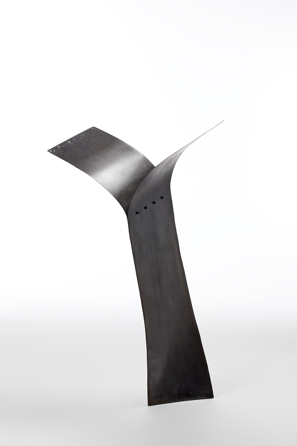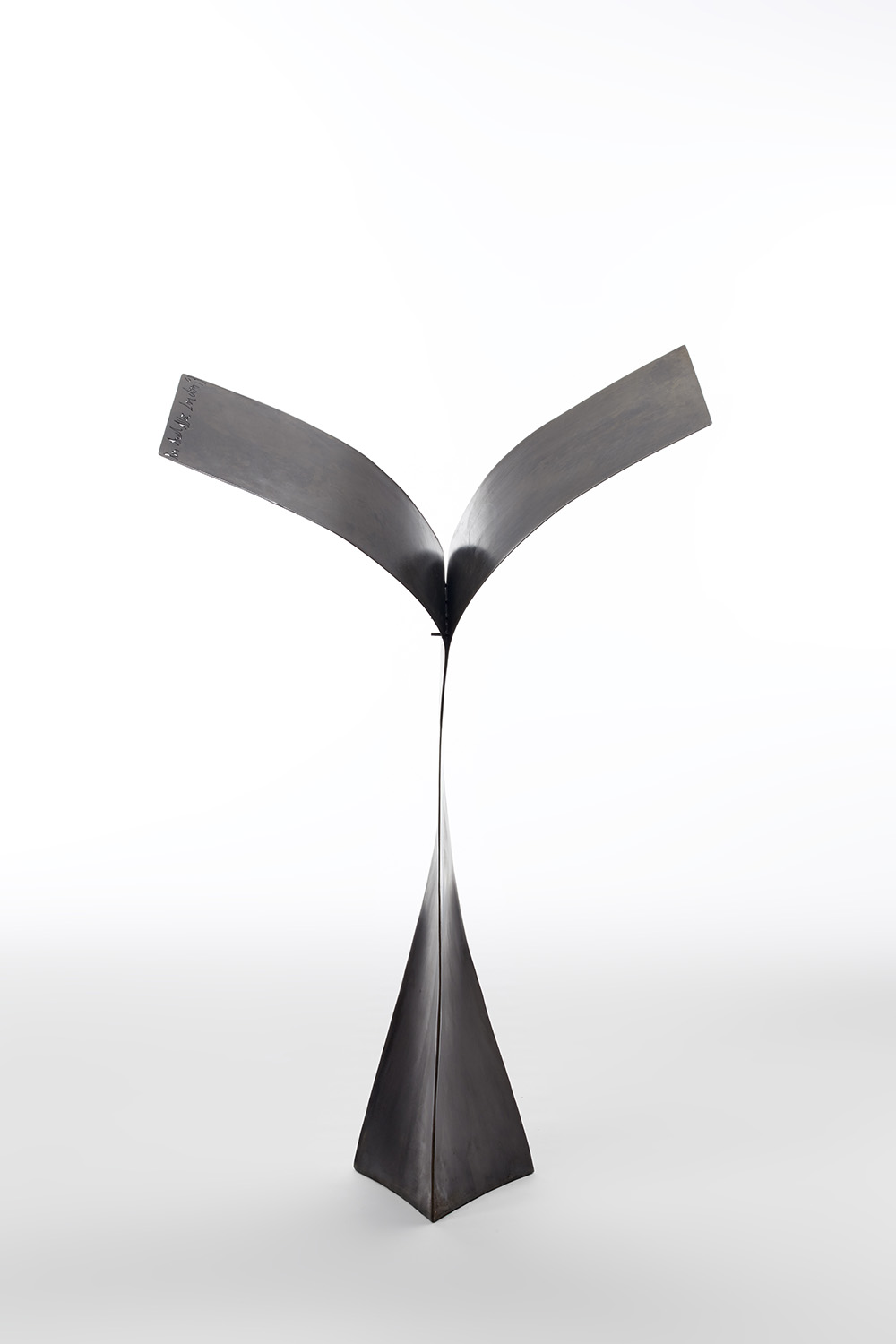 Sculpture-bookrest. London, 1993. Burnished steel in surface treated cut and bolted inscription. Signed, titled and dated on top left. (75x127x64 cm.)