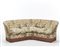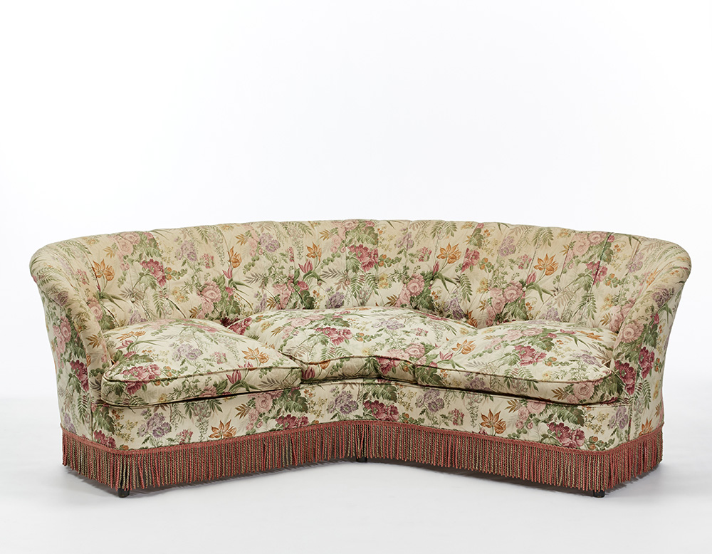 Divano angolare con struttura in legno massello e rivestimento in tessuto policromo trapunto a fiori e decorato con frange. Gambe troncoconiche in legno laccato grigio. Varedo, anni '40. (cm 225x77x130) (difetti)