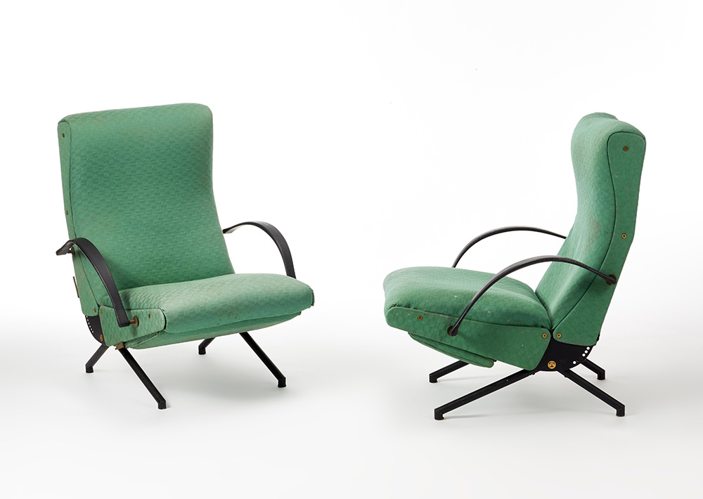 Coppia di poltrone modello "P40". Produzione Tecno, Varedo, 1955. Struttura in acciaio verniciato nero, minuterie e snodi in ottone tornito, gommapiuma e rivestimento in tessuto verde. (cm 142(max)x96,5(max)x72,5) (lievi difetti e mancanze)