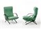 Pair of armchairs model "P40". Produced by Tecno, Varedo, 1955. Structure in black painted steel, small parts and joints in turned brass, foam rubber and covering in green fabric. (cm 142 (max) x96.5 (max) x72.5) (slight defects and losses)