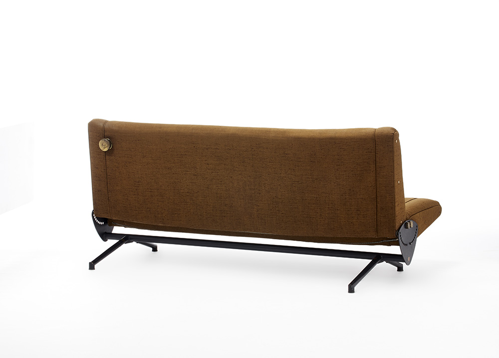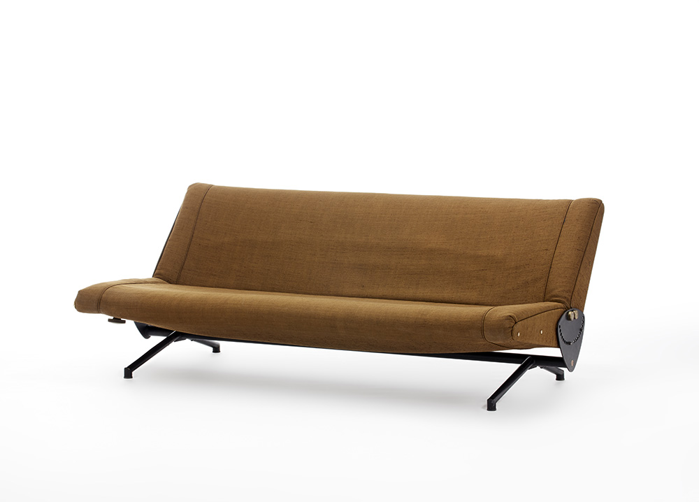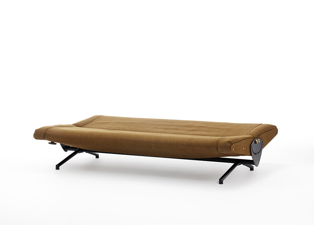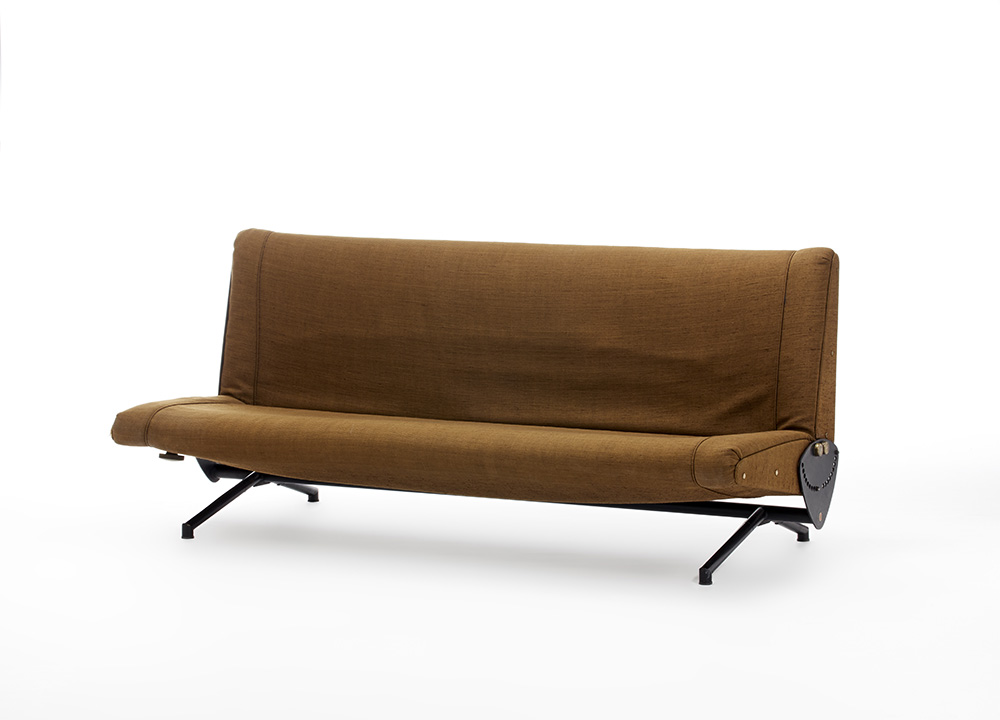 Divano trasformabile in letto modello "D70". Produzione Tecno, Varedo, 1954. Struttura mobile in metallo, imbottitura in gommapiuma su nastri in gomma, rivestimento in tessuto verde. Segnalazione al Compasso d'oro del 1954. (cm 190x84x115(max)) (difetti)