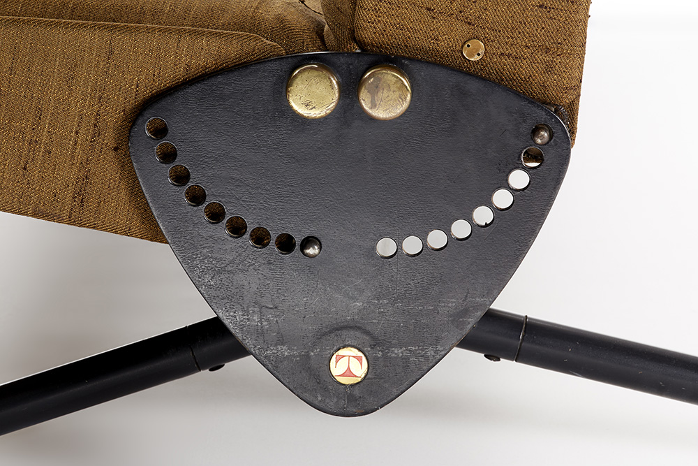 Sofabed model "D70". Produced by Tecno, Varedo, 1954. Mobile metal structure, foam rubber padding on rubber ribbons, green fabric covering. Reporting at the 1954 Compasso d'oro. (190x84x115 cm (max)) (defects)