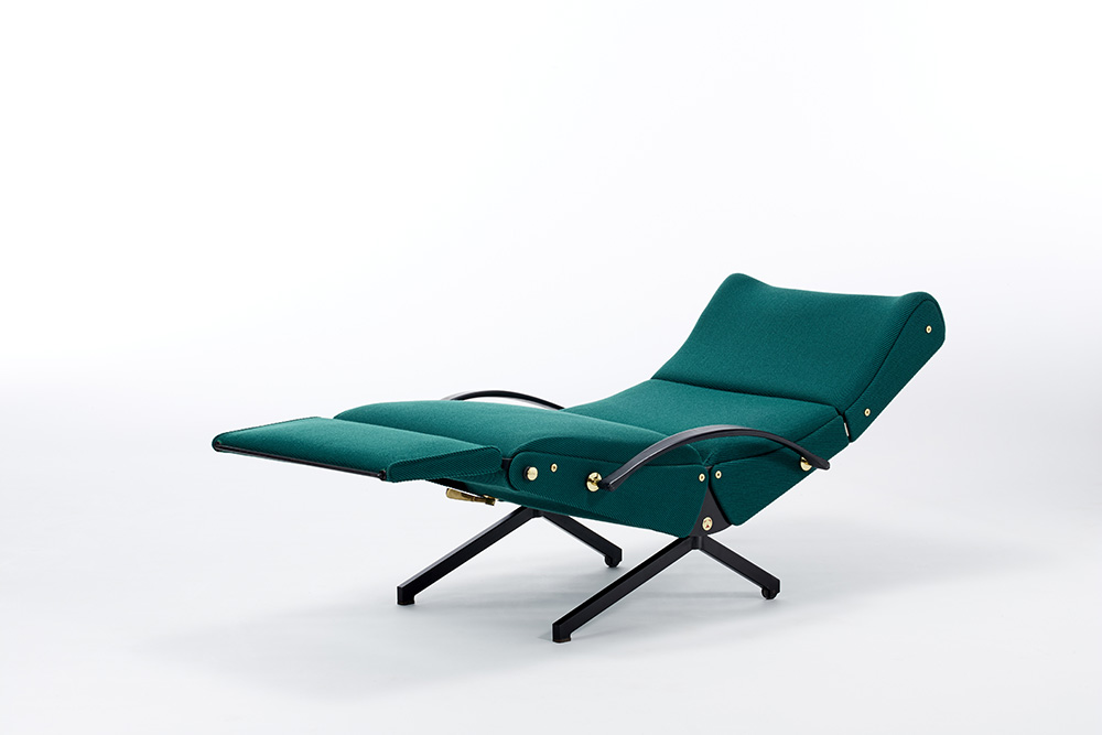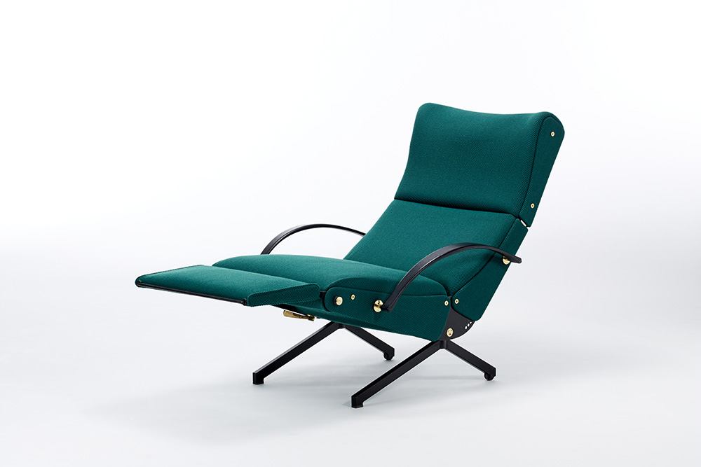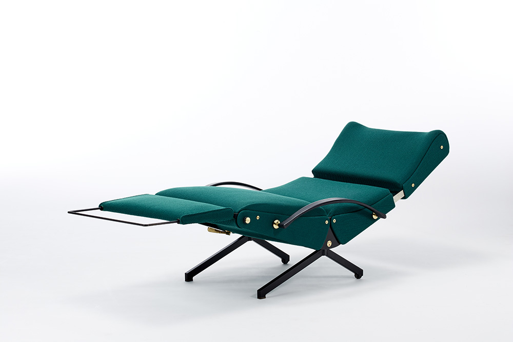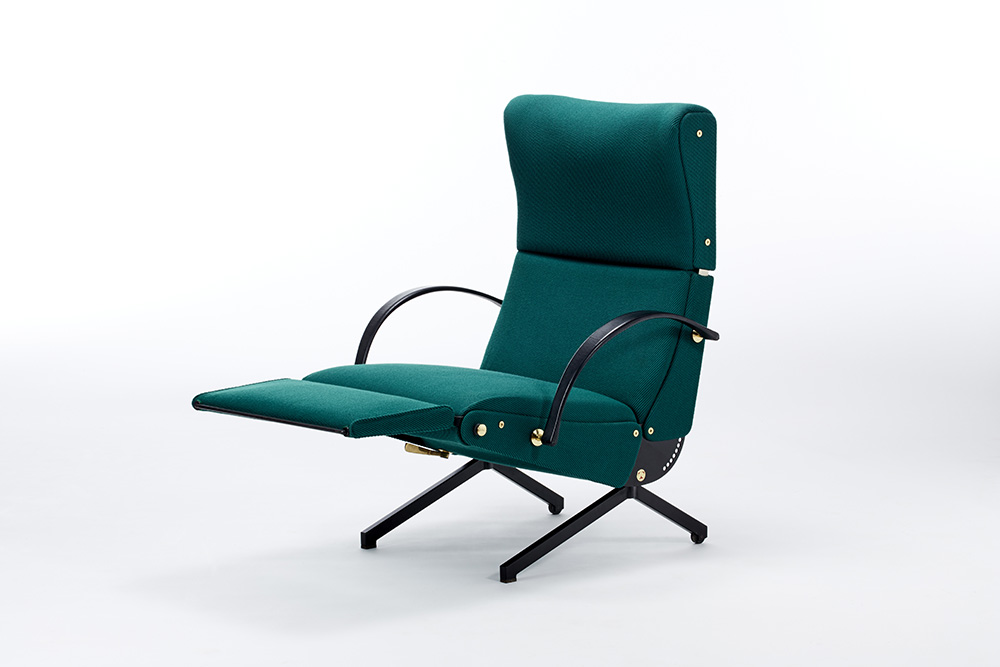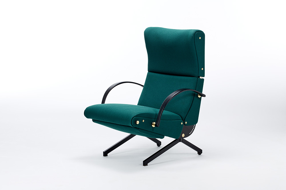 Poltrona modello "P40". Produzione Tecno, Varedo, disegno del 1955, esemplare di fine anni '60. Struttura in acciaio verniciato nero, minuterie e snodi in ottone tornito, gommapiuma e rivestimento in tessuto verde. (cm 142(max)x96,5(max)x72,5) (restauro con tessuto originale Tecno)
