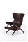 Poltrona modello "Fiorenza". Produzione Arflex, Milano, 1957, disegno del 1952. Struttura in legno massello con terminali in ottone, imbottitura in gommapiuma e rivestimento in panno marrone. (cm 74x99x85) (gravi difetti e restauri)