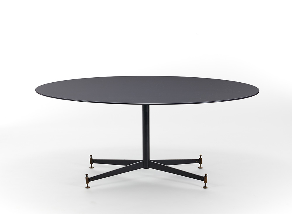 Tavolo modello "T2". Produzione Azucena, Milano, anni '50. Struttura in ferro laccato e piedini regolabili in ottone, piano in legno laccato blu scuro. (cm 180x77x131)