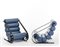 Coppia di poltrone modello "Balestra". Produzione Studio Most, Firenze, 1970. Metallo verniciato marrone scuro e pelle azzurro avio. (cm 81x85x93) (lievi difetti)
