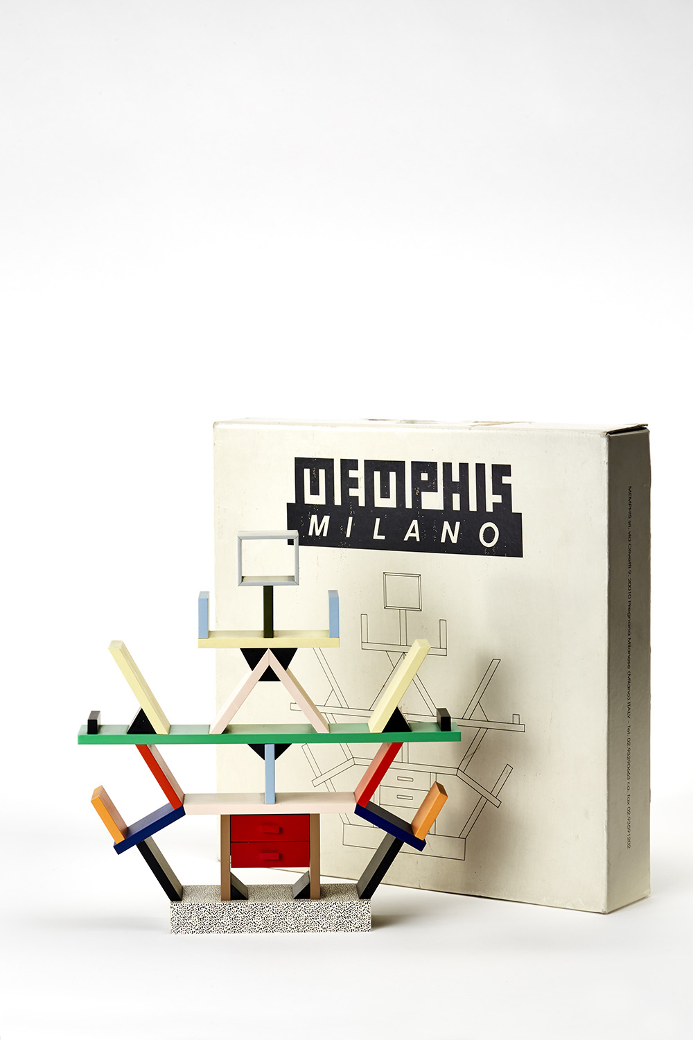Modello in scala 1:6 del mobile divisorio "Carlton". Memphis, Milano, 1981. Legno laccato, laminato. Multiplo 173/500. Firmato a pennarello "E. Sottsass" e numerato sotto la base. In scatola originale. (cm 32x33x5)