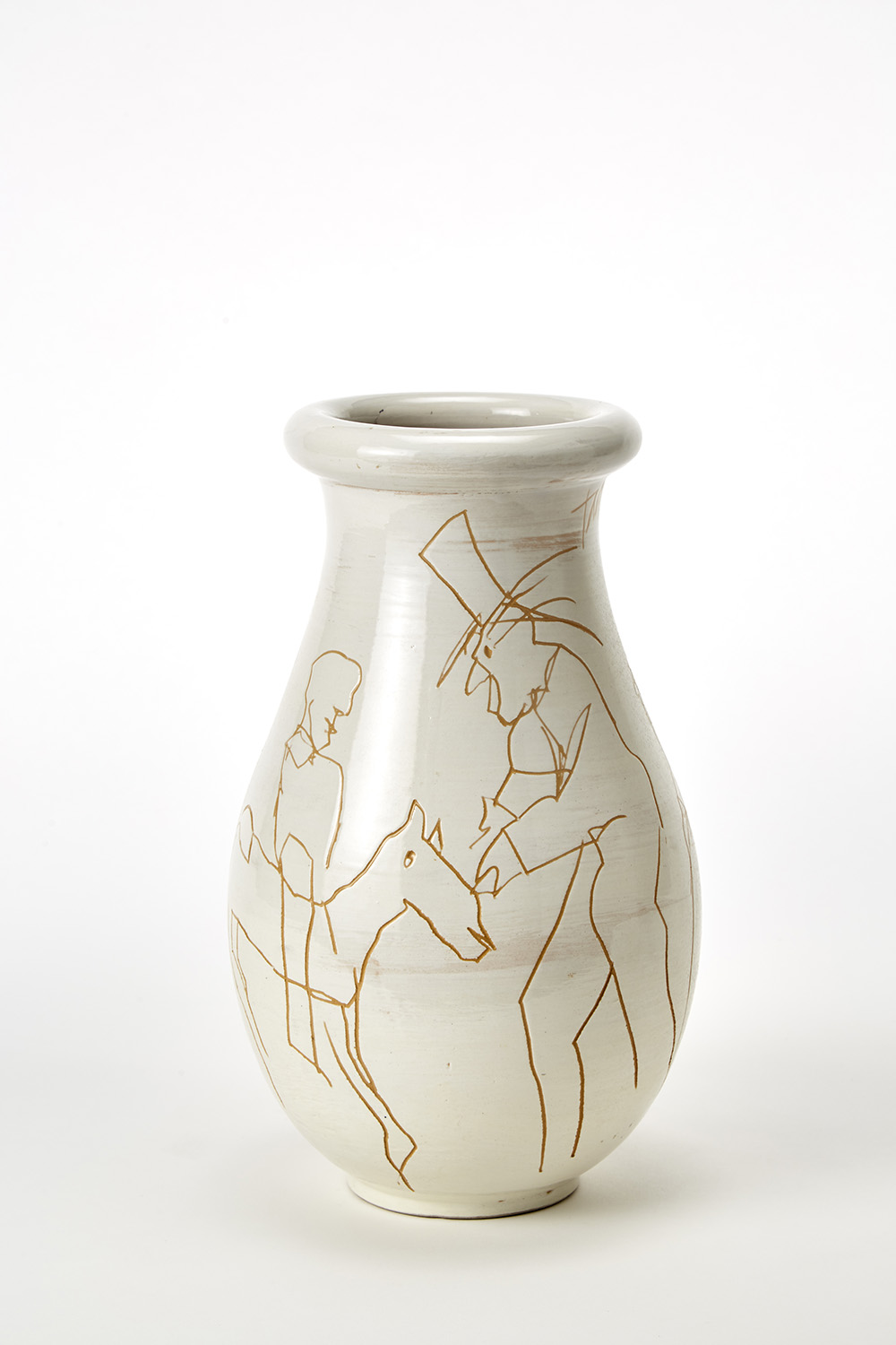 Vase in white glazed ceramic and etched with human figures. Manufacture of Ceramiche S. Giorgio, Albisola, 1990. Signed under the edge "Tadini" and marked "CER S. Giorgio Albisola" under the base. (h 36 cm.)