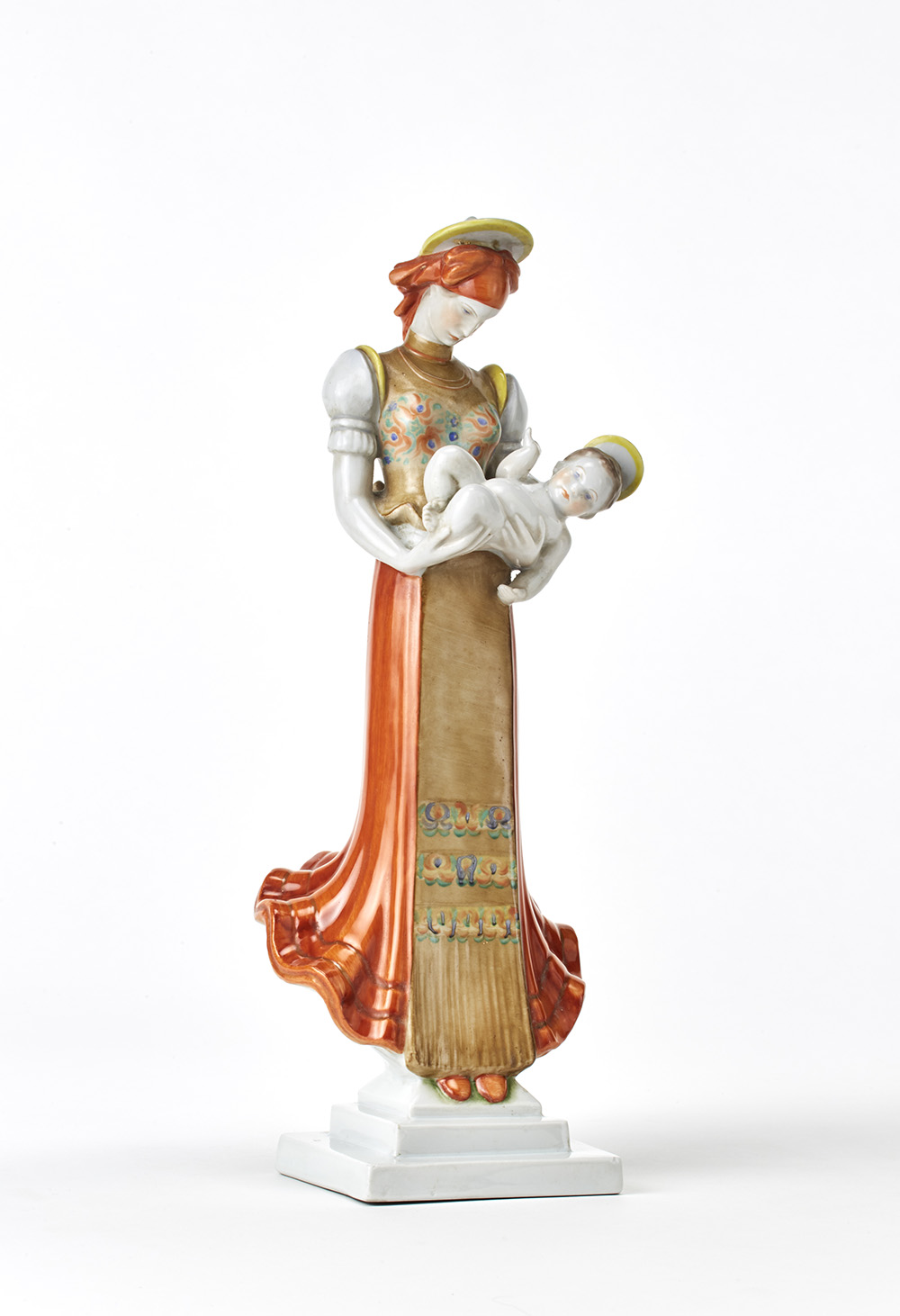 Scultura modernista in porcellana formata a colaggio e smaltata sottovetrina in policromia raffigurante madonna con bambino in stile déco. Ungheria, anni '30. (h cm 36)