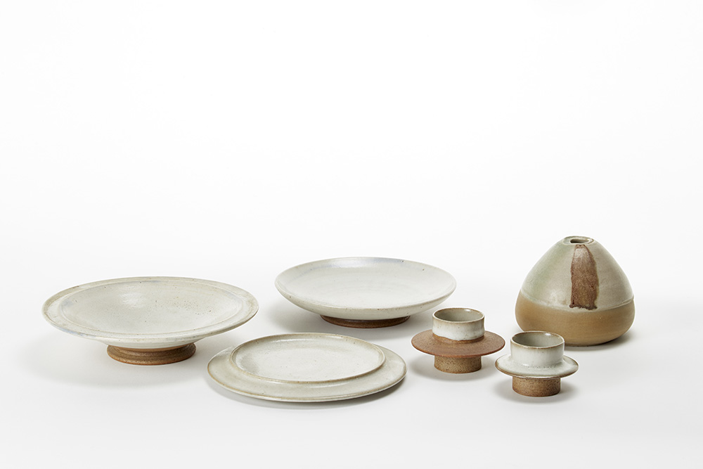 Lotto composto da tre alzatine, due portauova e un vaso soliflore in terracotta smaltata. Anni '70'/80. (Misure diverse) (lievi difetti)