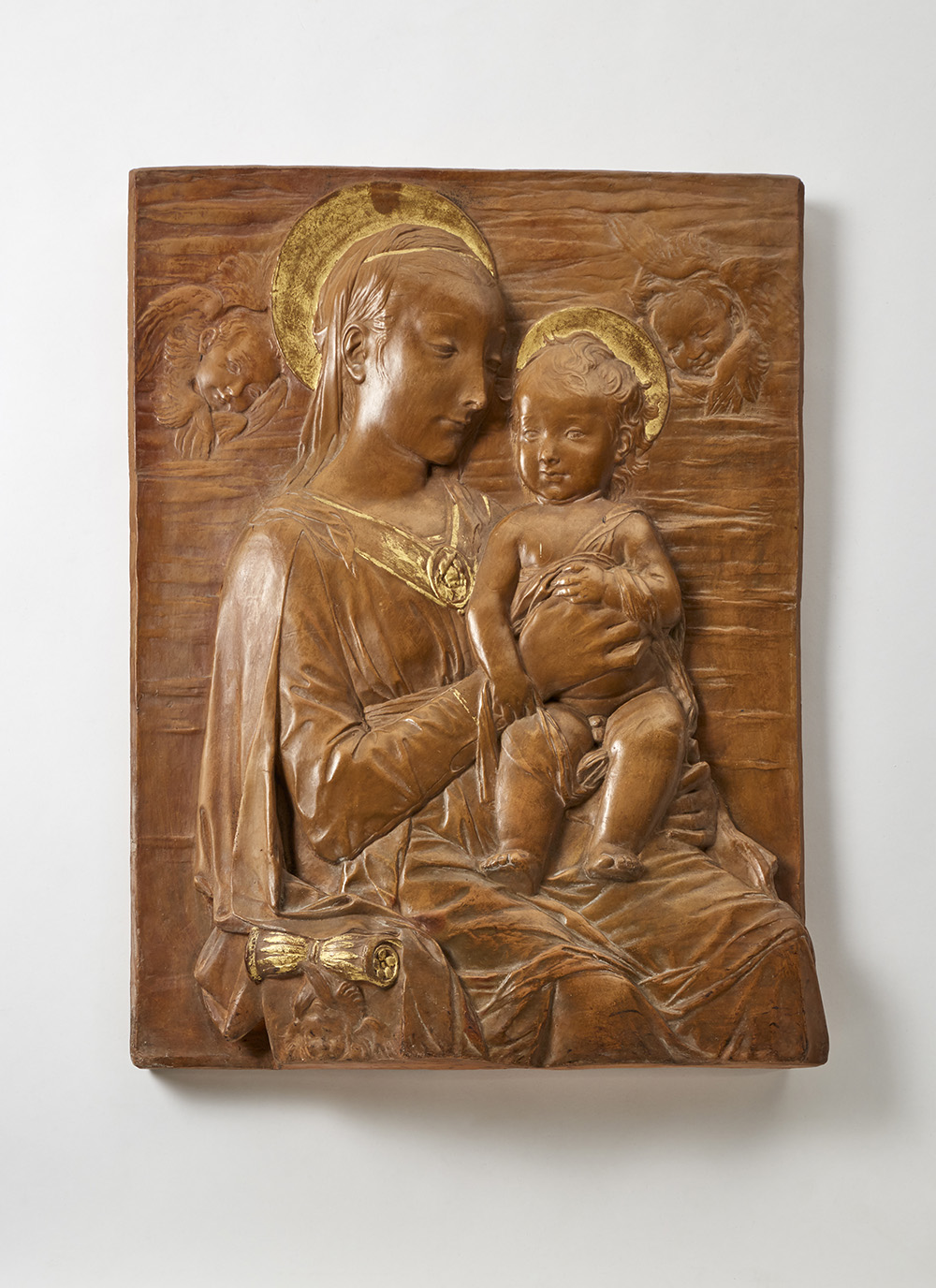 Grande formella in terracotta parzialmente dorata raffigurante Madonna con Bambino ispirata a opera rinascimentale. Firenze, seconda metà secolo XX. (cm 50x9x64) (lievi difetti)
