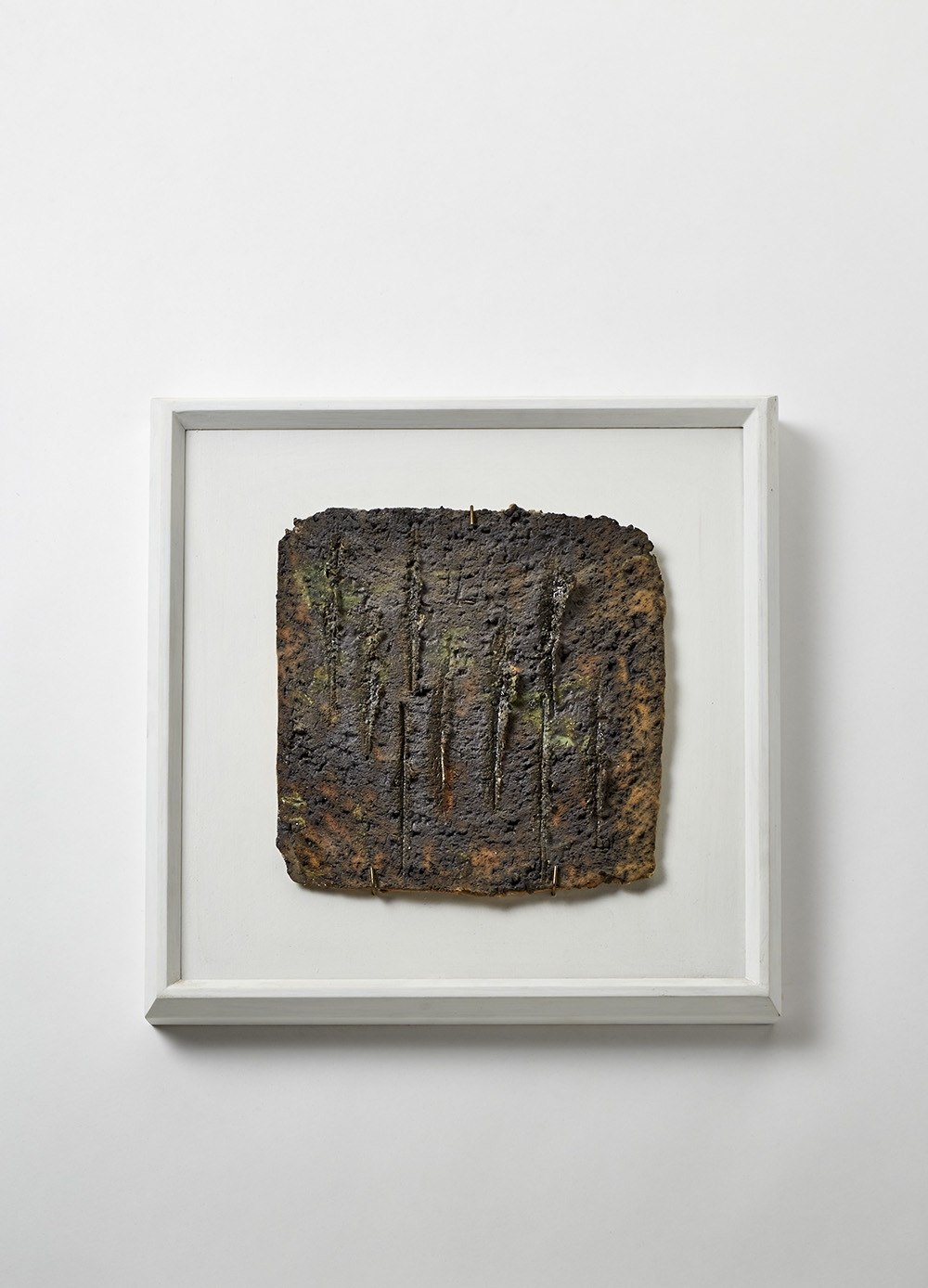 Formella in grés smaltato nei toni del bruno, del verde, dell'ocra e graffito con incisioni verticali. Italia, anni '50. (cm 23x24). In cornice. (lievi difetti)
