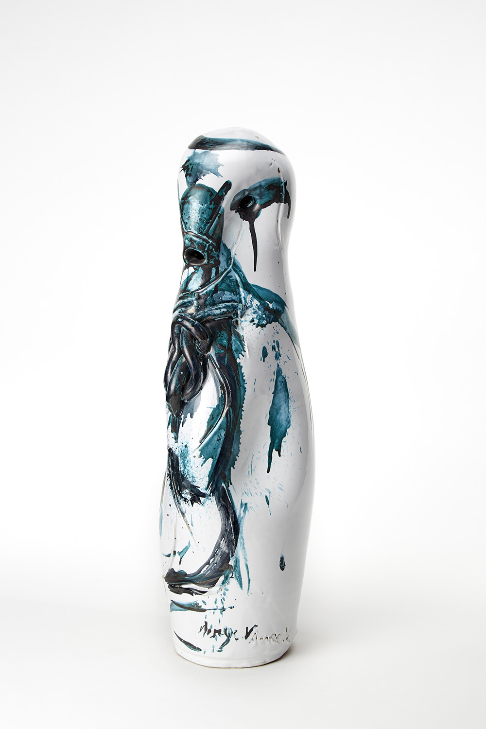 Glazed ceramic sculpture in white, green and gray underglazed. Manufacture of Ceramiche S. Giorgio, Albisola, 2003. Signed at the base and inscribed under the base. (h 60 cm.) (slight defects)