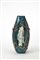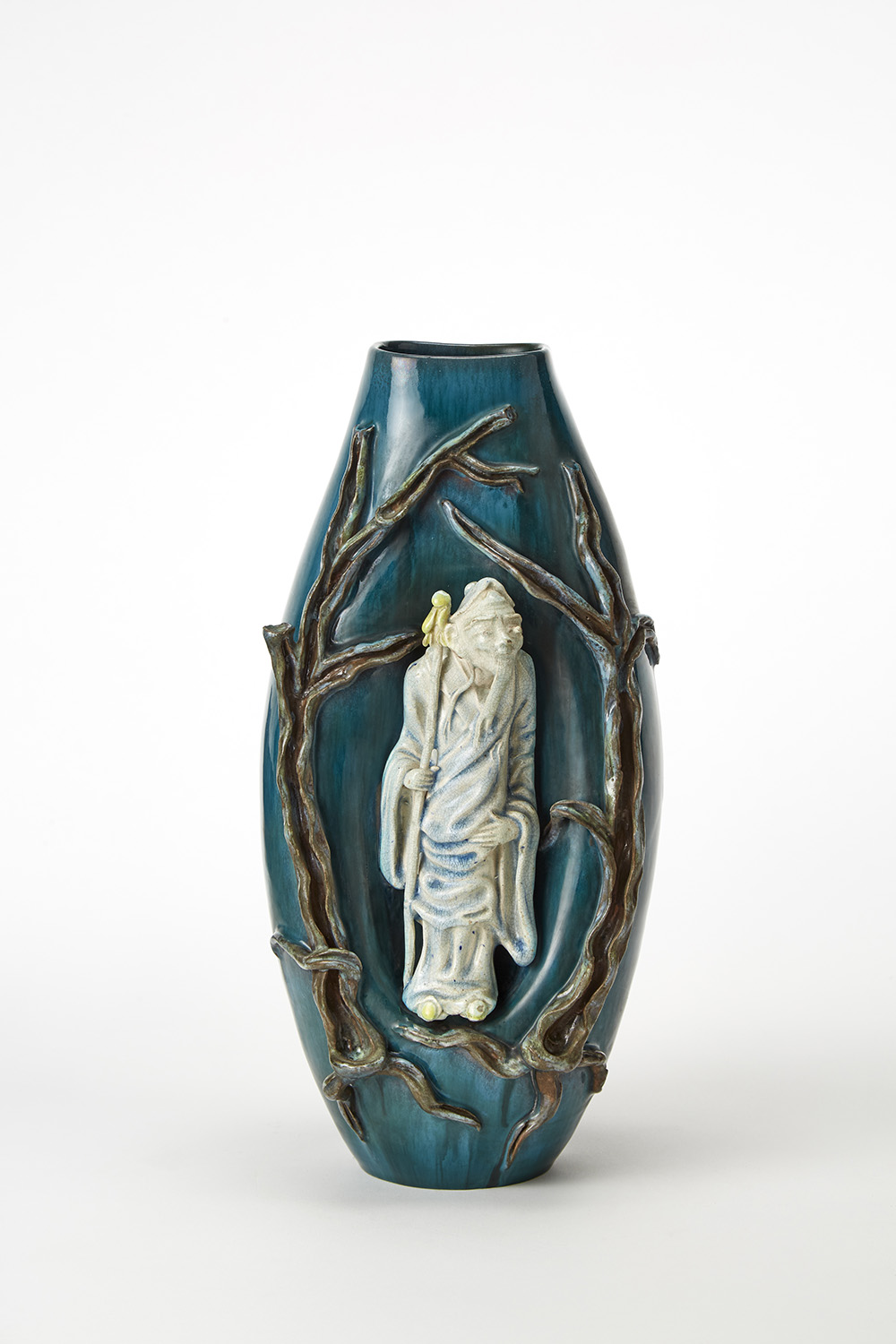 Vaso in grès smaltato a colature verdi e decorato ad altorilievo con racemi vegetali e figurina di anziano cinese. Firmato e marcato con simbolo grafico della manifattura sotto la base. (h cm 37) (lievi difetti)