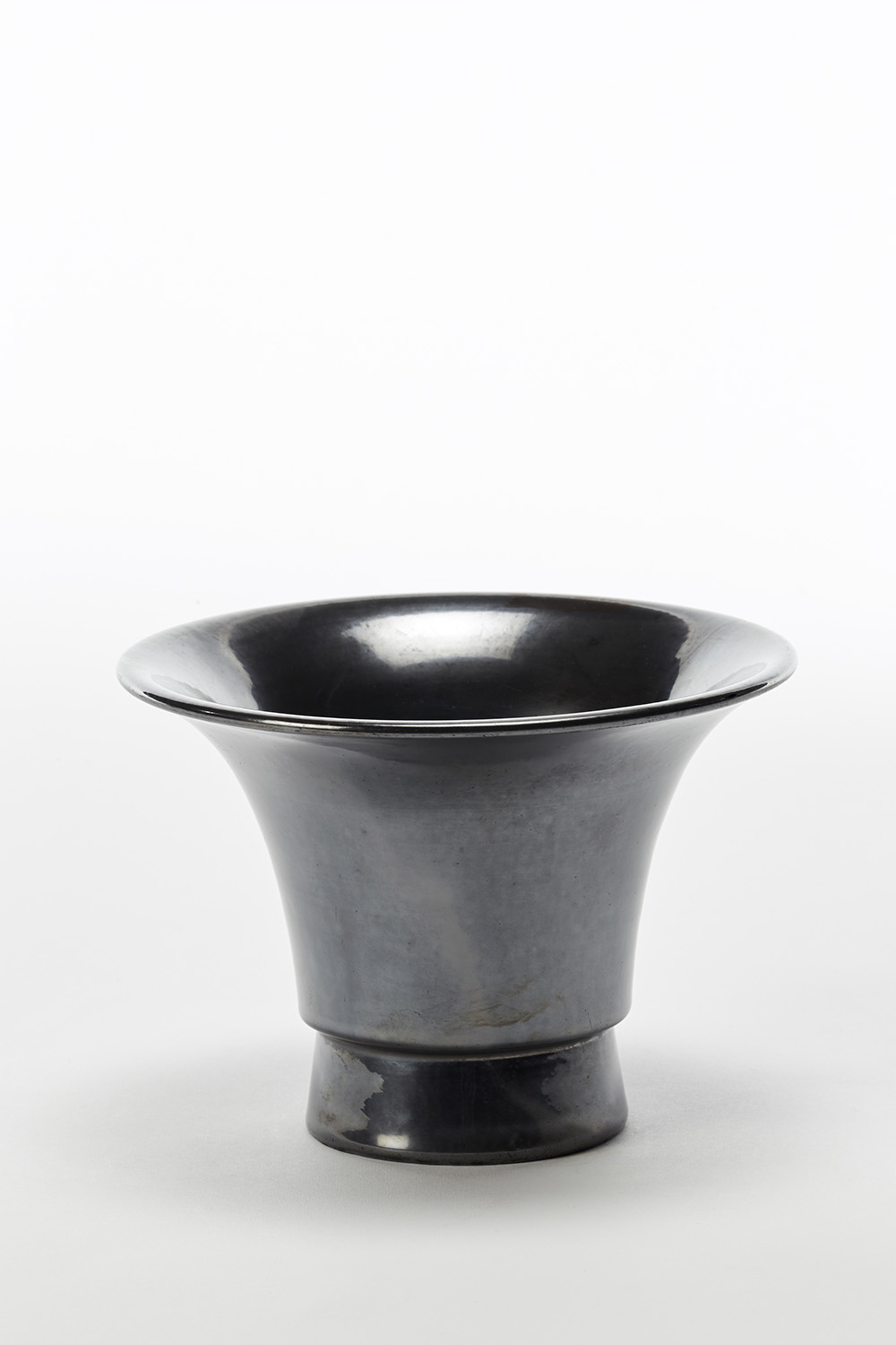 Vaso a tromba in ceramica smaltata nera a riflessi metallici. Francia, anni '30. Iscrizione "BONIFAS MADE IN FRANCE" incisa sotto la base. (h cm 14; d cm 20)
