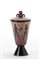 Vaso con coperchio a corpo e base troncoconica in ceramica smaltata a fasce orizzontali in nero, bianco e vinaccia, decorato sotto vetrina con figure rappresentanti Adamo ed Eva e la cacciata dall'Eden. Umbertide, anni '30. Firma graffita sotto la base "Rometti Umbertide Made in Italy". (h cm 29) (lievi difetti e restauri)