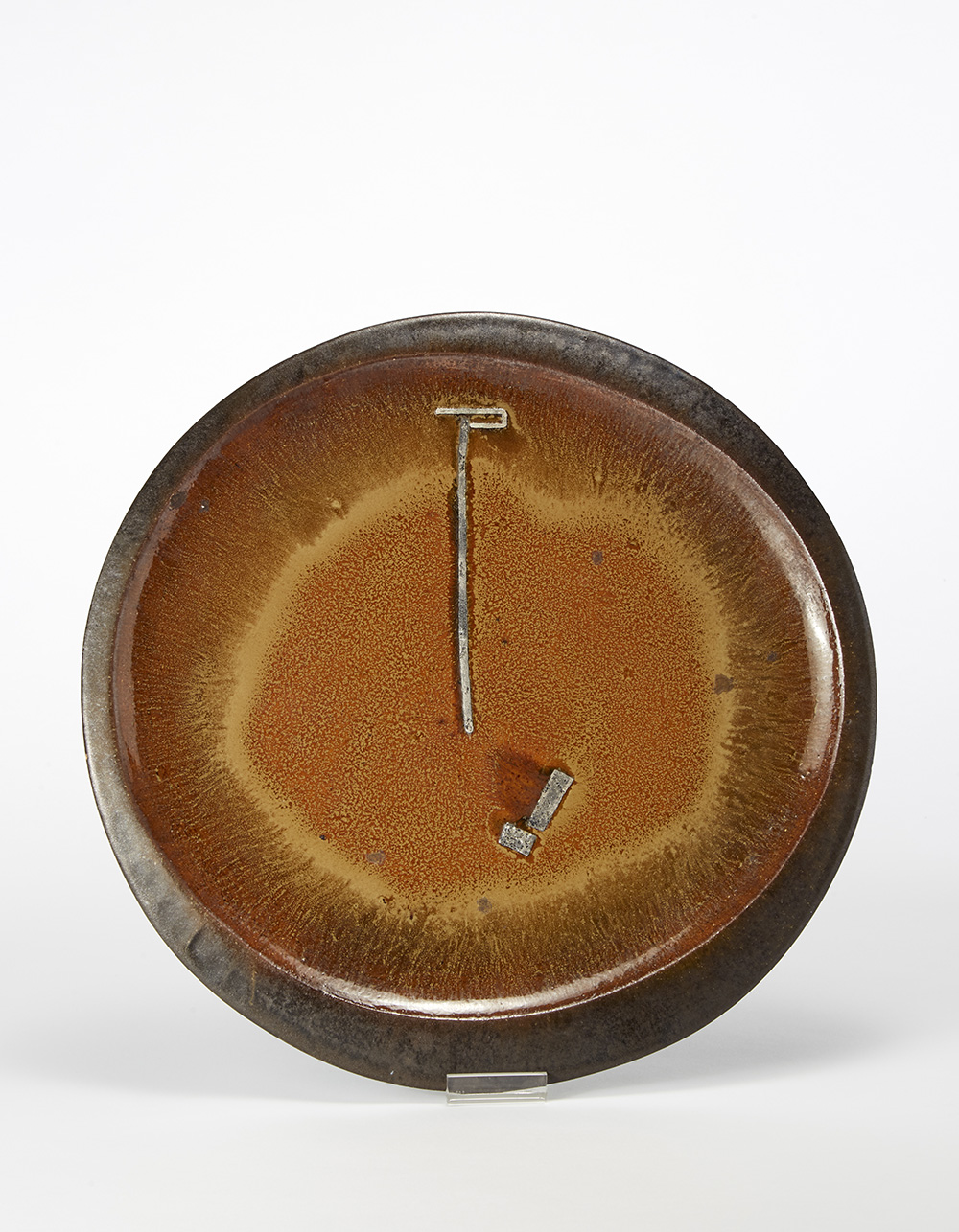 Beige and brown glazed ceramic plate with abstract metal inlay. Milan, 1950s. (d 41 cm.) (slight defects and minor restorations)