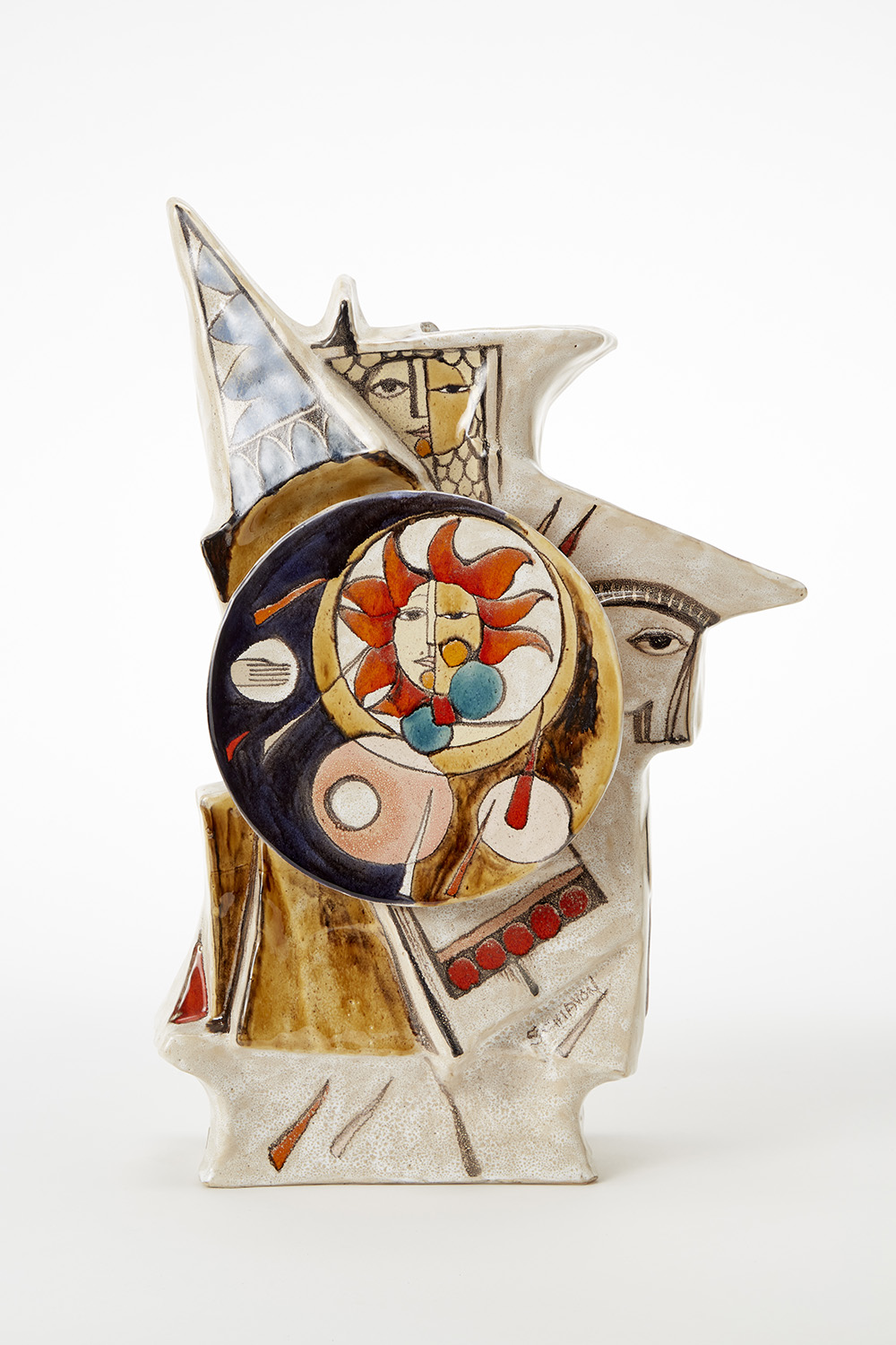 Polychrome underglaze cast ceramic vase formed with figures of the sun, moon and a horse. 1950s. (h 52 cm.)