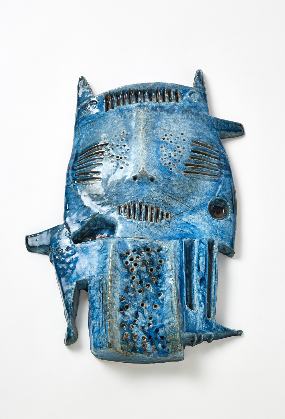 Etched and glazed ceramic mask in light blue tones underglazed. Faenza, 1950s/1960s. Signed in the verso "U. Zannoni Faenza". (36x46 cm.) (slight defects)