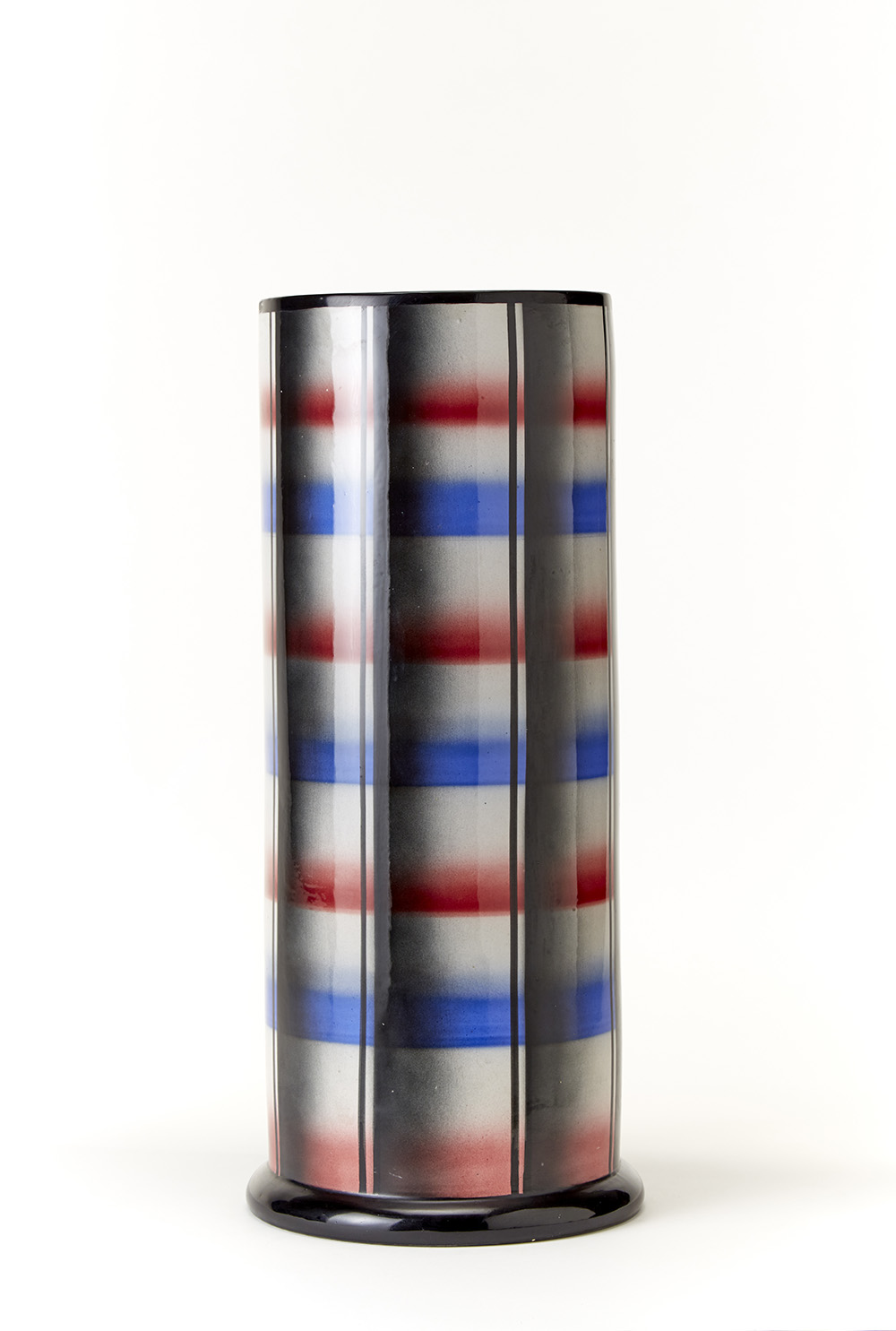Portaombrelli in ceramica futurista smaltata all'aerografo sotto vetrina con motivo geometrico in nero, rosso e blu su fondo bianco. Rometti, Umbertide, anni '30. Iscritta "CR Italy" sotto la base. (h cm 54) (difetti e restauri)
