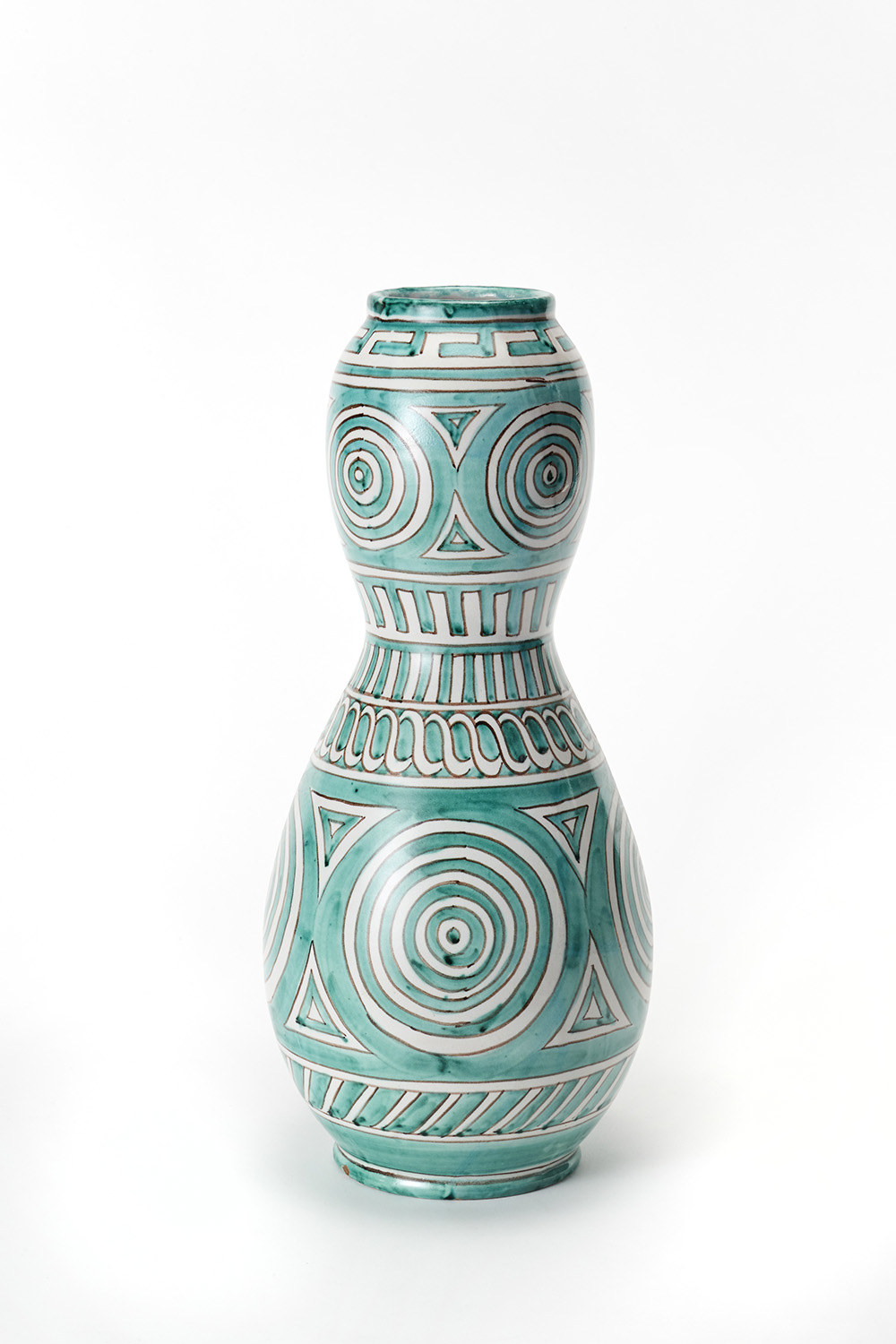 White, green and brown glazed ceramic vase decorated with geometric motifs. Manufacture of di Vietri, 1930s. Signed under the base "PINTO VIETRI ITALIA". (h 50 cm.) (slight defects and small restorations)
