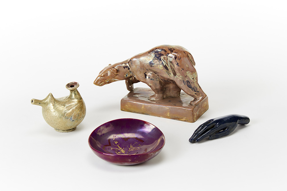 Lot consisting of a bear sculpture in glazed ceramic with metallic luster in the shade of red-purple, an "Aryballos" in glazed ceramic with metallic luster in shades of green and cream with palm relief decoration, a glazed bowl with metallic luster in the shades of purple with gold decorations, a sculpture of hand in underglazed ceramic in shades of blue and yellow.. Faenza, 20th century. The bear and the Aryballos marked "MELANDRI", the bowl marked "MELANDRI" and with the M monogram squared. (Bear: 21x12.5x10.5 cm; Aryballos: 7.5x8.5x5.5 cm; hand: l 13.5 cm; small bowl: 12.5x3.5x11 cm) (defects)