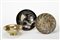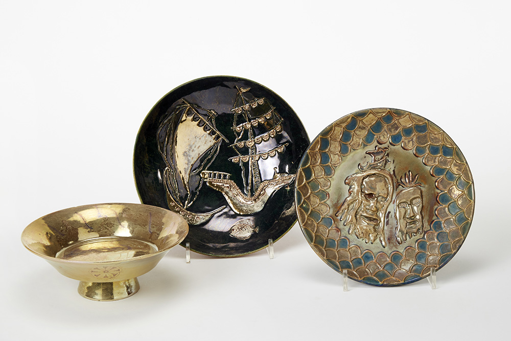 Lotto composto da un piatto con decorazioni a rilievo di volti umani, una ciotola con figurazione in rilievo di veliero e un'alzatina con decorazione di pavone in ceramica smaltata in policromia a lustri metallici sotto vetrina. Faenza, secolo XX. Il piatto marcato "MELANDRI FAENZA", la ciotola marcata "MELANDRI" con il simbolo della melagrana e il monogramma della M, l'alzatina marcata "MELANDRI". (piatto: d cm 23; ciotola: d cm 24,5 e h cm 6; alzatina: d cm 20,5 e h cm 8)) (difetti)