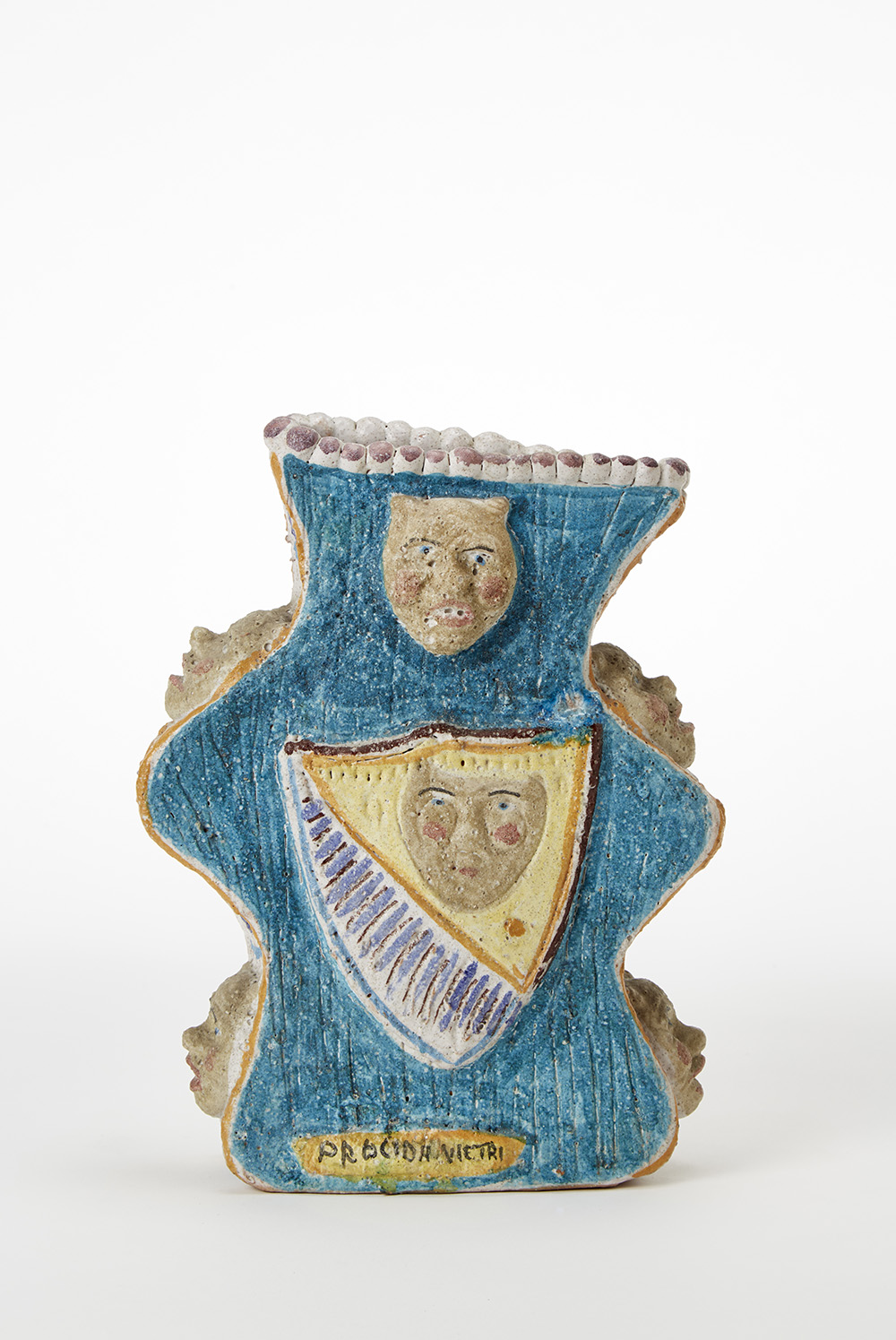 Rustic ceramic vase with masks and emblem in relief glazed in opaque polychromy. Vietri Sul Mare, 1960s/1970s. "Procida Vietri" at the base. (24x30x14 cm.) (slight defects)