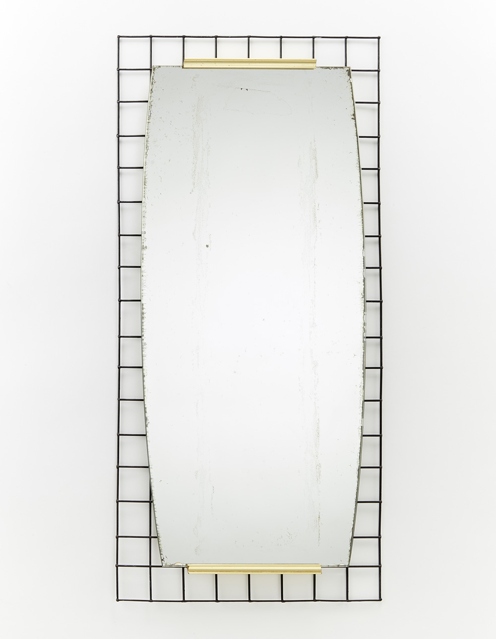 Specchio su rete in tondino metallico verniciato nero e montatura in alluminio ottonato. Italia, anni '50/'60. (cm 40x85) (lievi difetti)