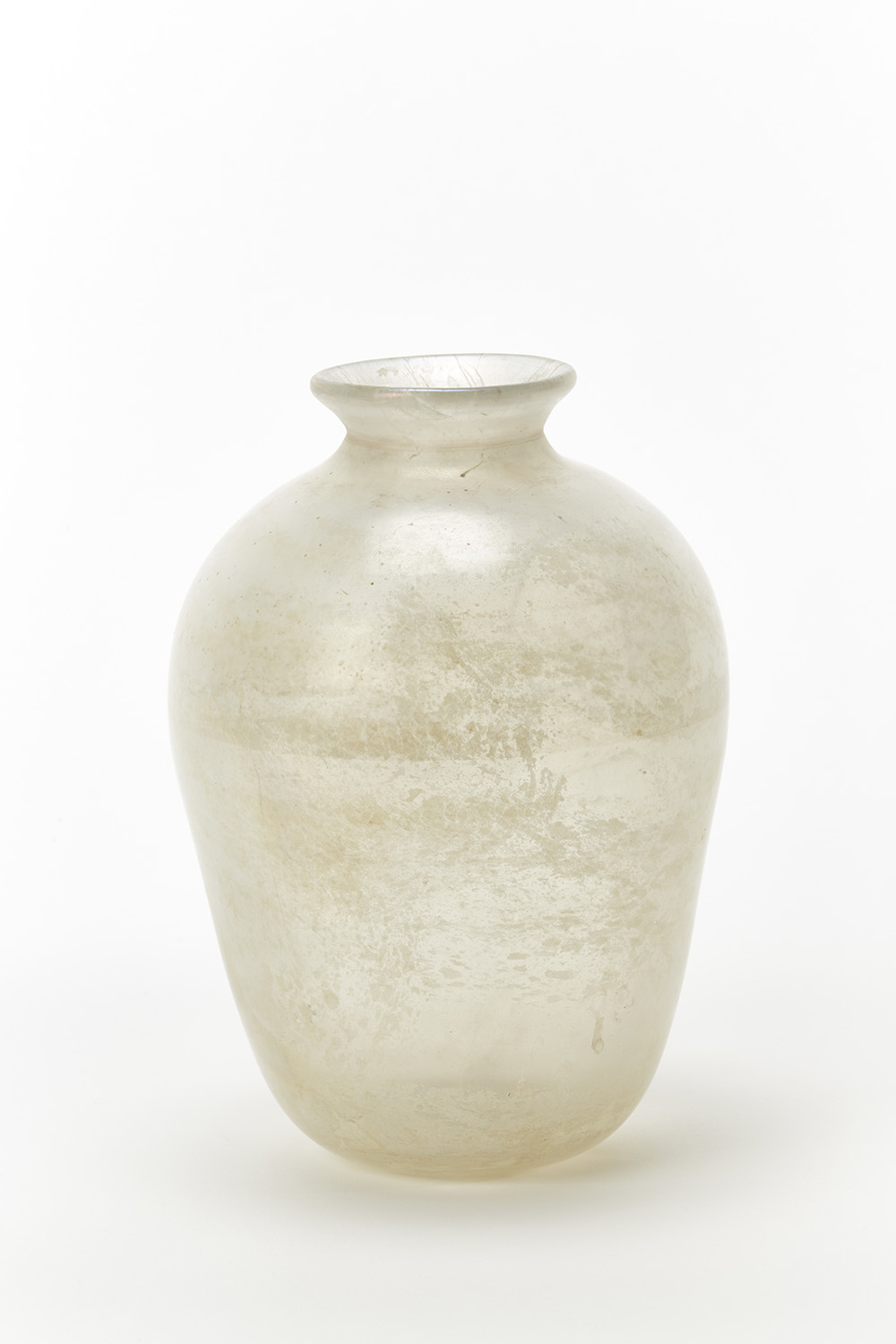 Vase in transparent blown glass slightly iridescent on the outer surface and with acid decoration on the inner surface. Italy, 1970s. (h 27 cm.) (slight defects)
