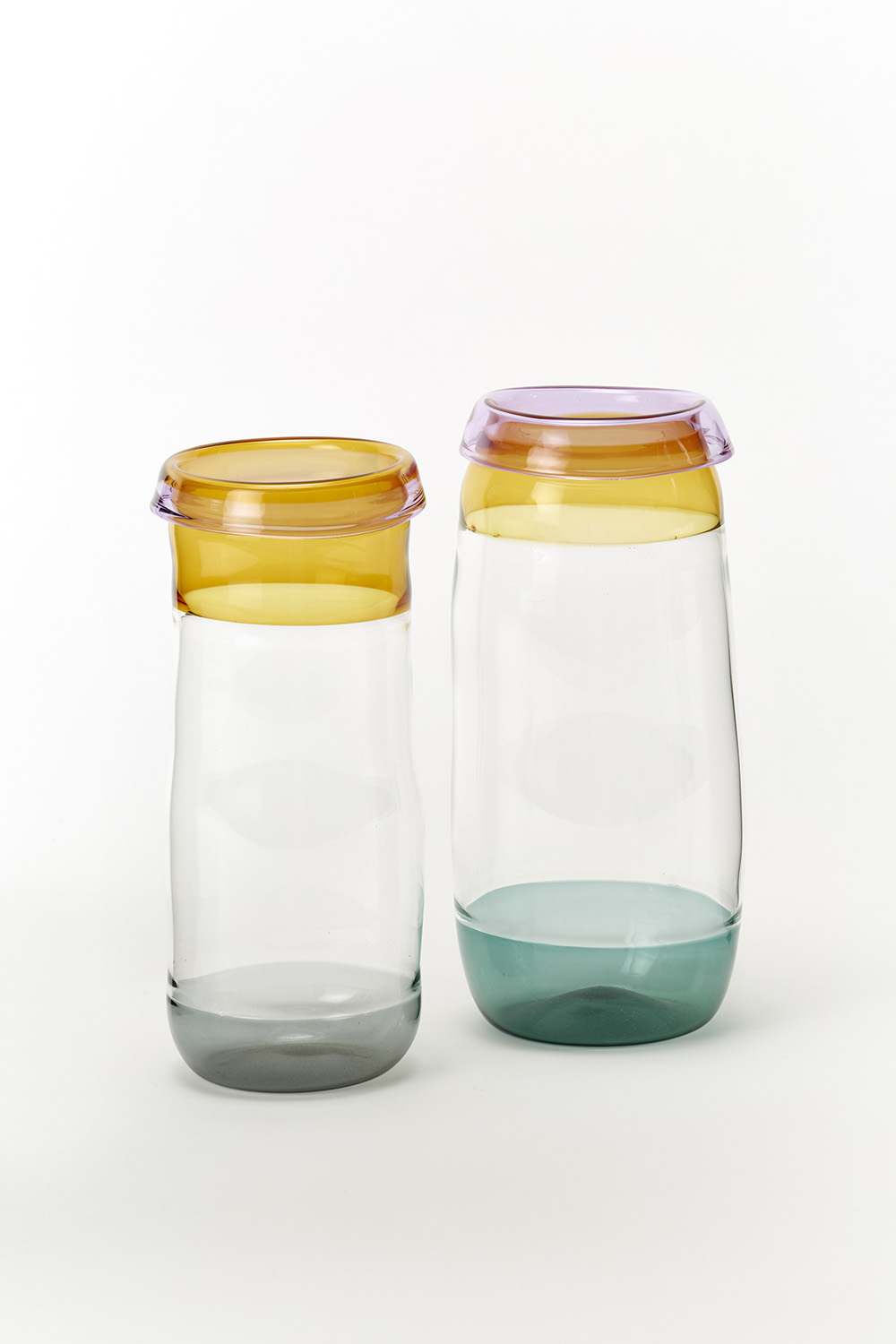 Due vasi ad incalmo in vetro trasparente fumé, incolore, giallo, verde e ametista. Anni '70'/80. (h cm 22,5 e d cm 10 e h cm 21,5 e d cm 10)