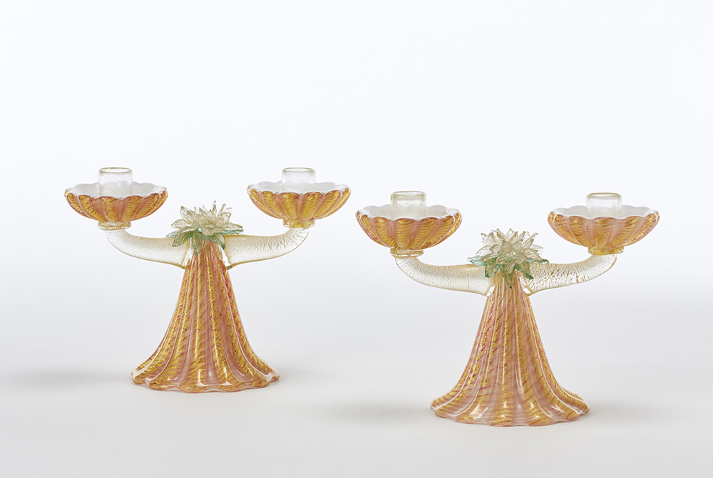 Manifattura di Murano ITA Coppia di candelieri in vetro costolato incamiciato...
