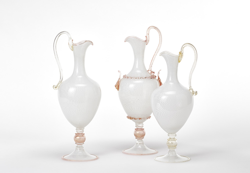 Lotto composto da tre brocche ansate in vetro soffiato incolore a mezza filigrana lattimo con applicazioni di foglia d'oro e di vetro rosato. Anni '80/'90. (h max cm 43)