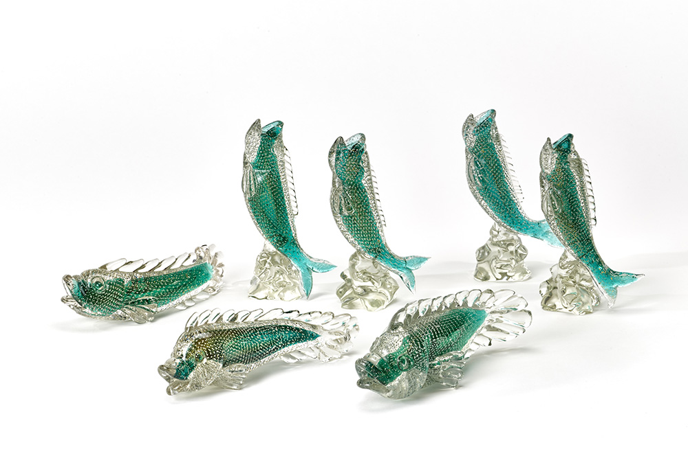 Group of seven fish in sommerso crystal and transparent green glass with inclusion of bubbles and gold leaf. Murano, 1950s. Some example are signed under the base "Seguso Murano MADE IN ITALY". (Different sizes) (slight defects)