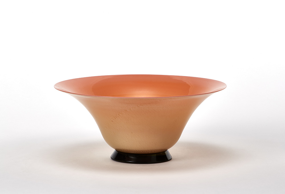 Ciotola della serie "Aurati". Murano, 1992. Vetro "Laguna" incamiciato rosa con applicazione di foglia d'oro, base in vetro trasparente ambrato applicata a caldo. Disegno n°500.2. Iscritto a punta sotto la base "venini 92". (h cm 12,3)