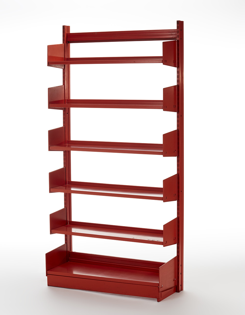 Six-shelf bookcase in printed iron plate and box red painted. Italy, 1950s/1960s. (100x200x31 cm.) (slight defects)