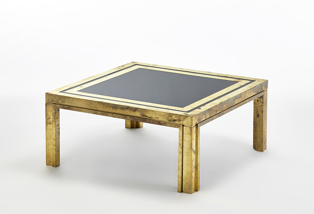 Tavolino da caffè in ottone e plexiglass nero. Roma, anni '70. Marcato a incussione sul fianco. (cm 90x40x90) (difetti e restauri)