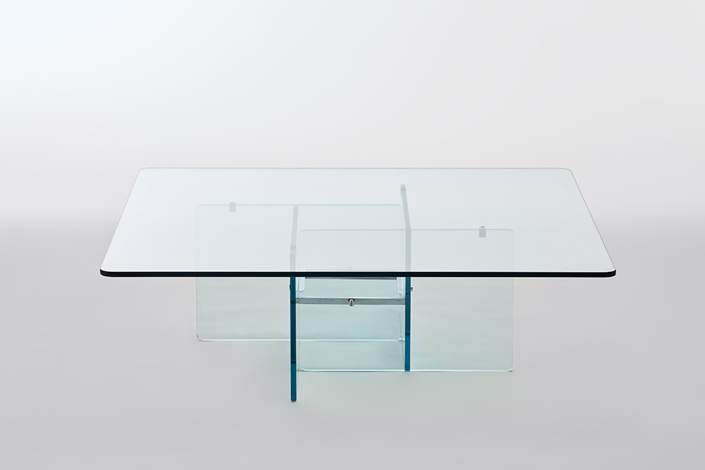 Tavolo da salotto con struttura e piano quadrato in cristallo molato trasparente verdino, sottostruttura in acciaio. Italia, anni '70'/80. (cm 110x34x110) (piccole mancanze)