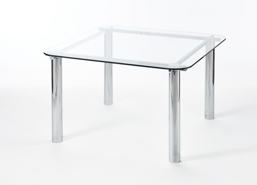 Tavolo con piano in cristallo e gambe in tubolare metallico. Italia, anni '70. (cm 125x72,5x125)