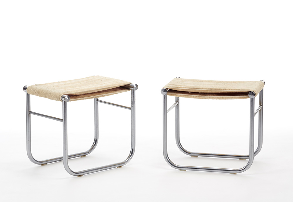 Pair of tables model "LC9". Produced by Cassina, Meda, drawing from 1927, models from the 70s / 80sStructure in chromed metal, seat covered in cream-colored sponge. Marked. (51x46x37 cm.) (slight defects)
