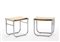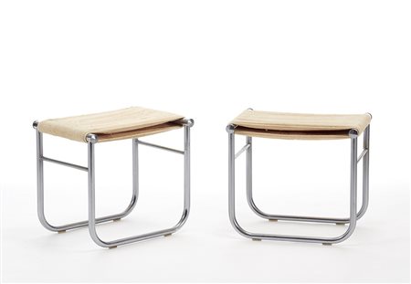 Coppia di tavolini modello "LC9". Produzione Cassina, Meda, disegno del 1927, esemplari degli anni '70/'80. Struttura in tubolare metallico cromato, seduta rivestita in spugna color panna. Marcati. (cm 51x46x37) (lievi difetti)