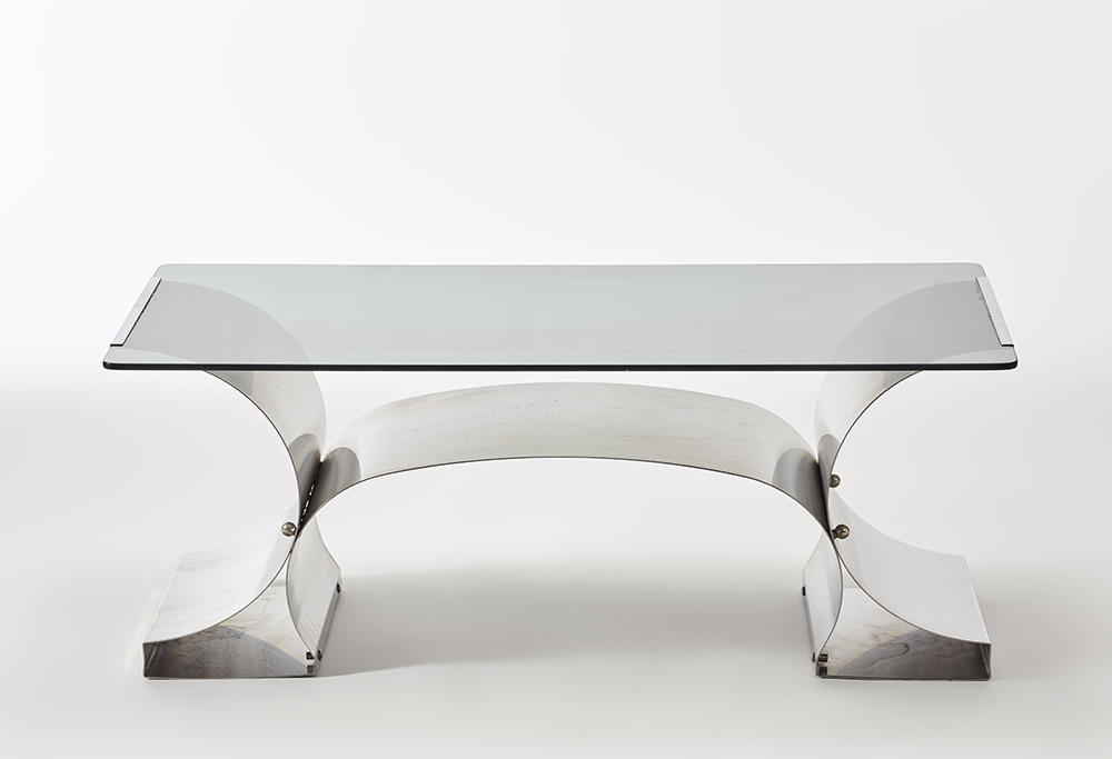 Tavolo basso. Produzione Kappa, Francia, 1970ca. Lastre calandrate di acciaio inossidabile e ripiano in vetro molato. (cm 104,5x40,5x60)