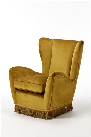 Poltrona imbottita con rivestimento in velluto color senape decorata con frange, gambe in legno di noce massello. Cantù, anni '50. (cm 73x90x75) (lievi difetti)