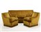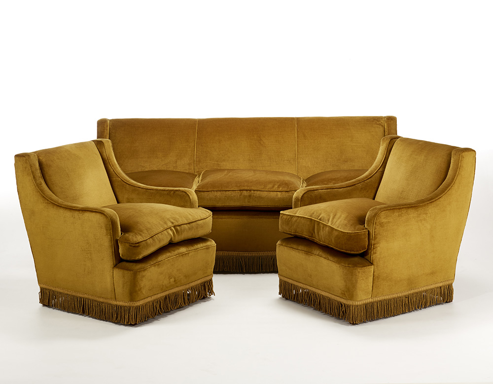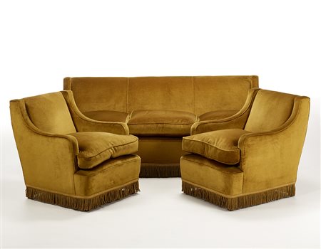 Salotto composto da un divano a tre posti e due poltrone imbottiti e rivestiti in velluto color senape decorato con frange, gambe in legno di noce massello. Cantù, anni '50. (divano: cm 195x81x80; poltrone: cm 71x81x80) (lievi difetti)