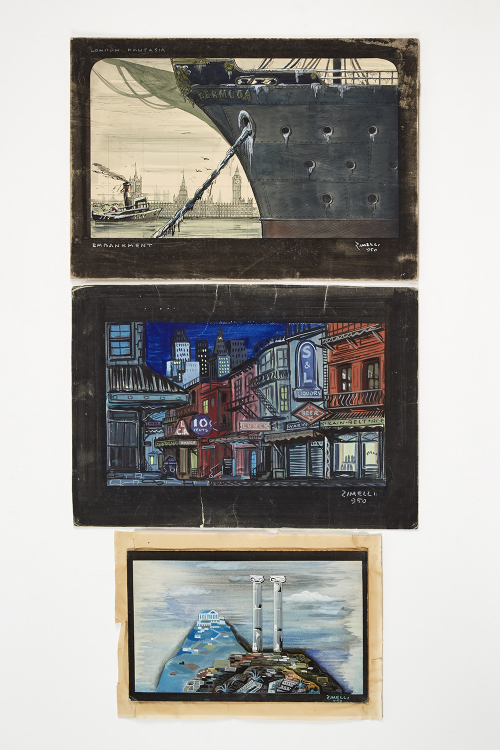 Lotto di tre bozzetti per scenografia teatrale. Milano, 1950. Tecnica mista su cartoncino. Firmati e datati "ZIMELLI 50". (cm 22,5,34,5; cm 35,5x50; cm 35,5x50) (lievi difetti)