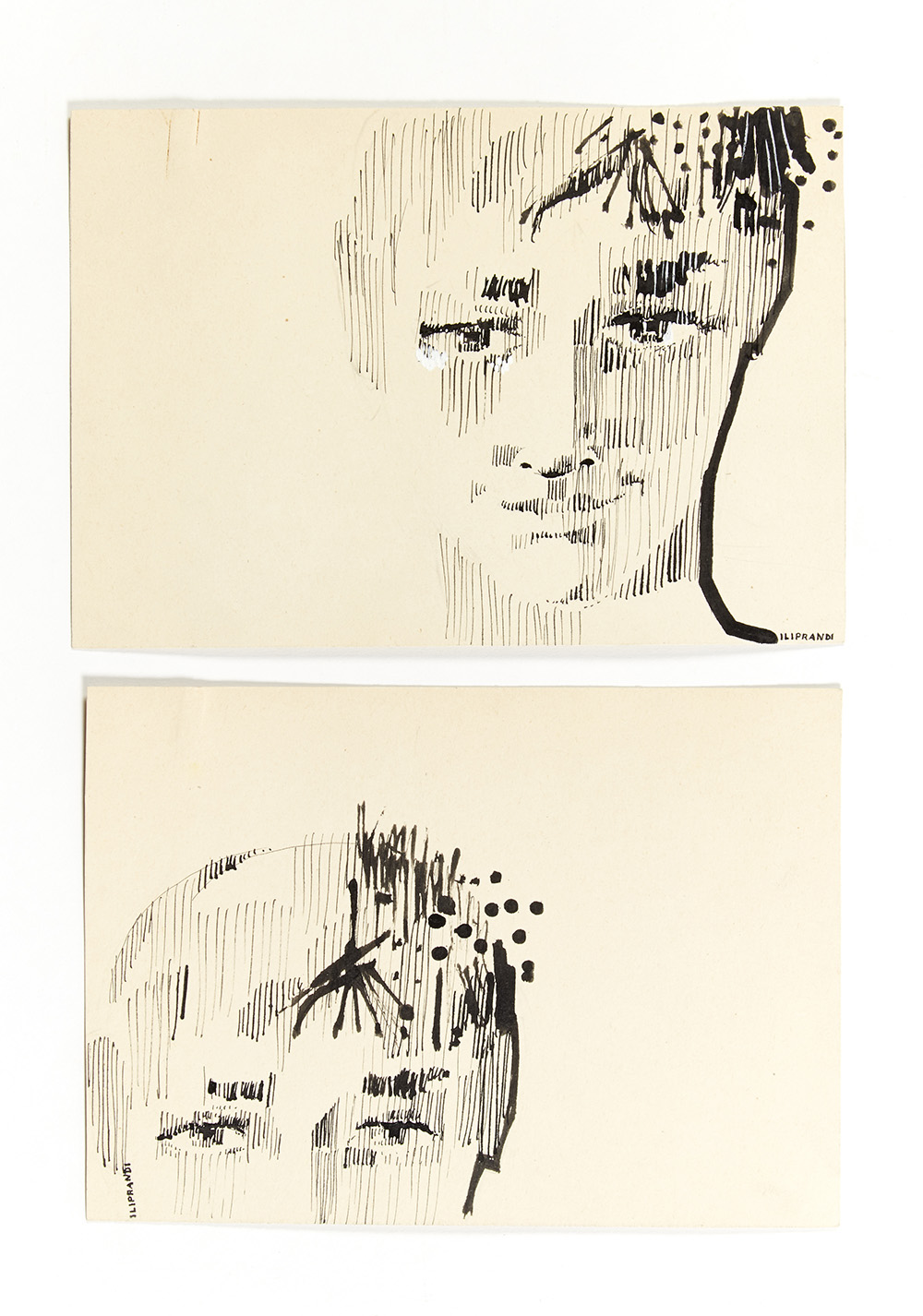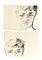 Lot of two drawings depicting a female face. Milan, 1950s. Black marker, ink, pencil and white biacca on cardboard. Signed lower right and lower left. (15.5x22.3 cm and 15.7x21.8 cm)