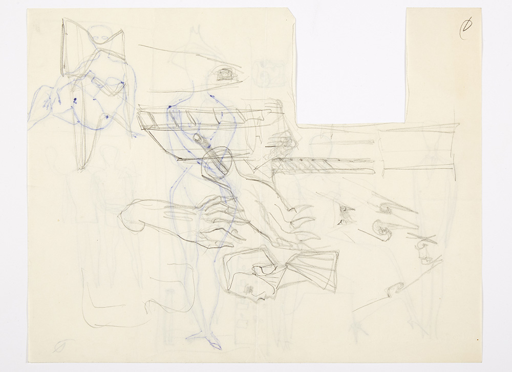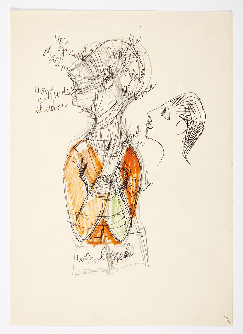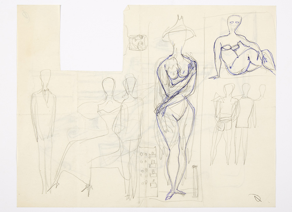 Due fogli recanti schizzi di una figura con motti, di figure femminili e di mani. Milano, anni '50/'60. Penna a sfera nera e blu, pennarelli e grafite su carta. (Misure varie) (lievi difetti)