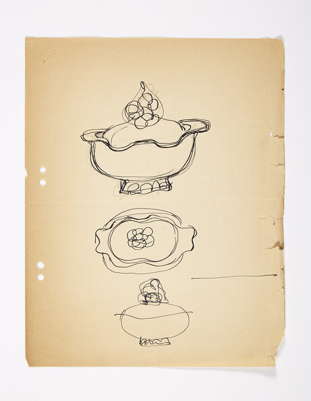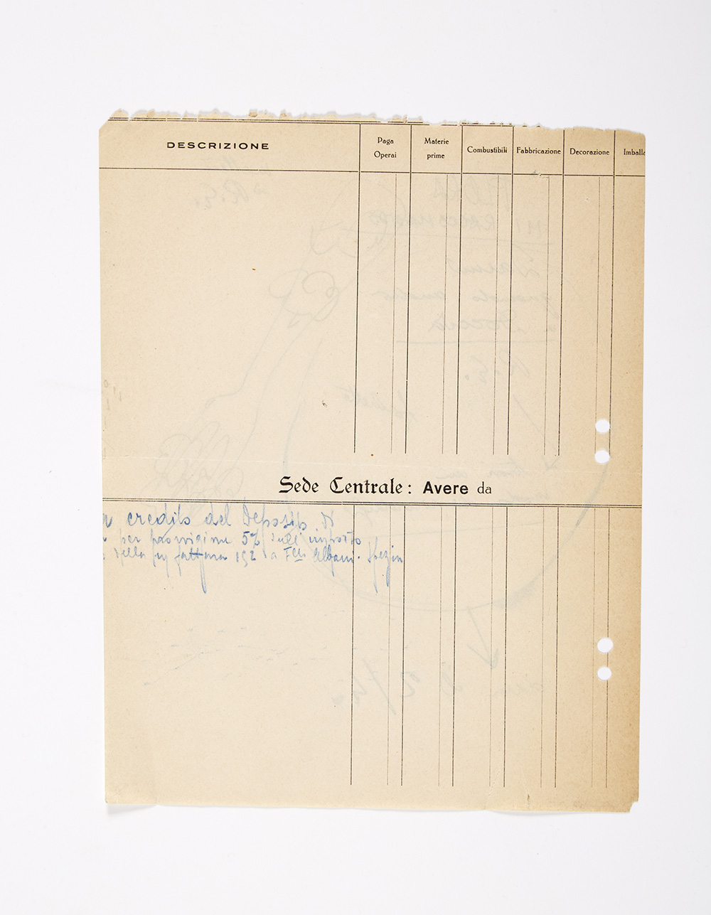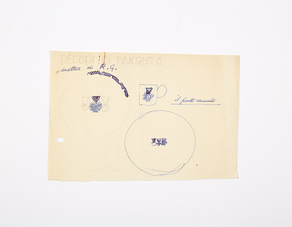 Sette fogli recanti schizzi e annotazioni per decori e oggetti in ceramica eseguiti per Richard Ginori. Milano, anni '20/'30. Grafite, pastello verde e inchiostro blu su carta. (Misure varie) (lievi difetti)