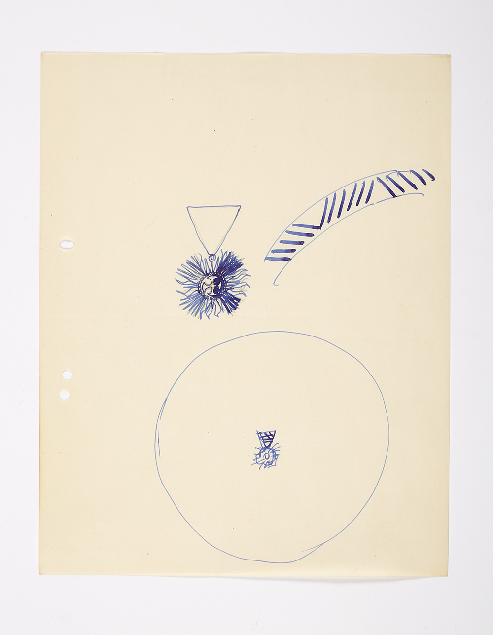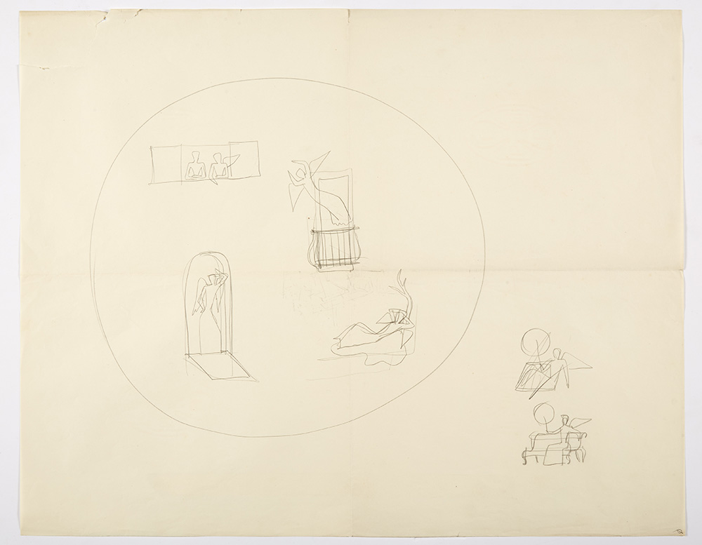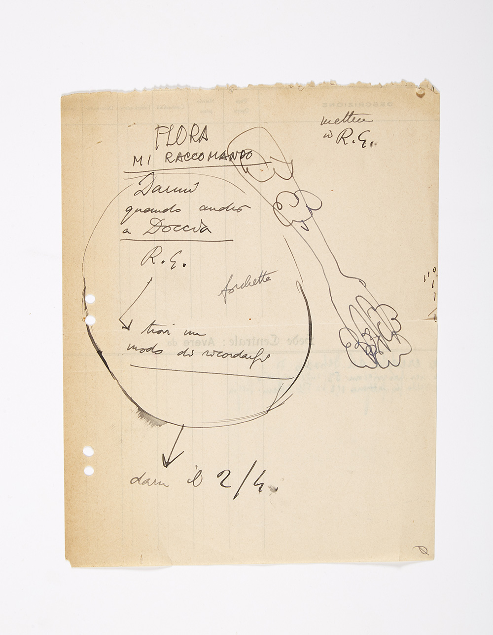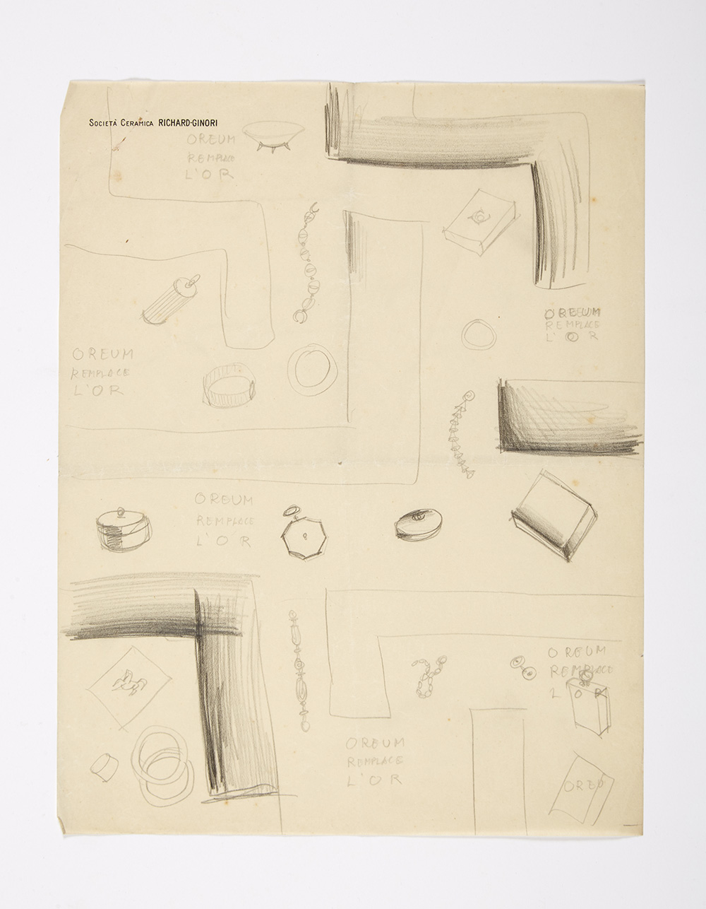 Seven sheets bearing sketches and annotations for decorations and ceramic objects made for Richard Ginori. Milan, 1920s/1930s. Graphite, green pastel and blue ink on paper. (Different sizes) (slight defects)