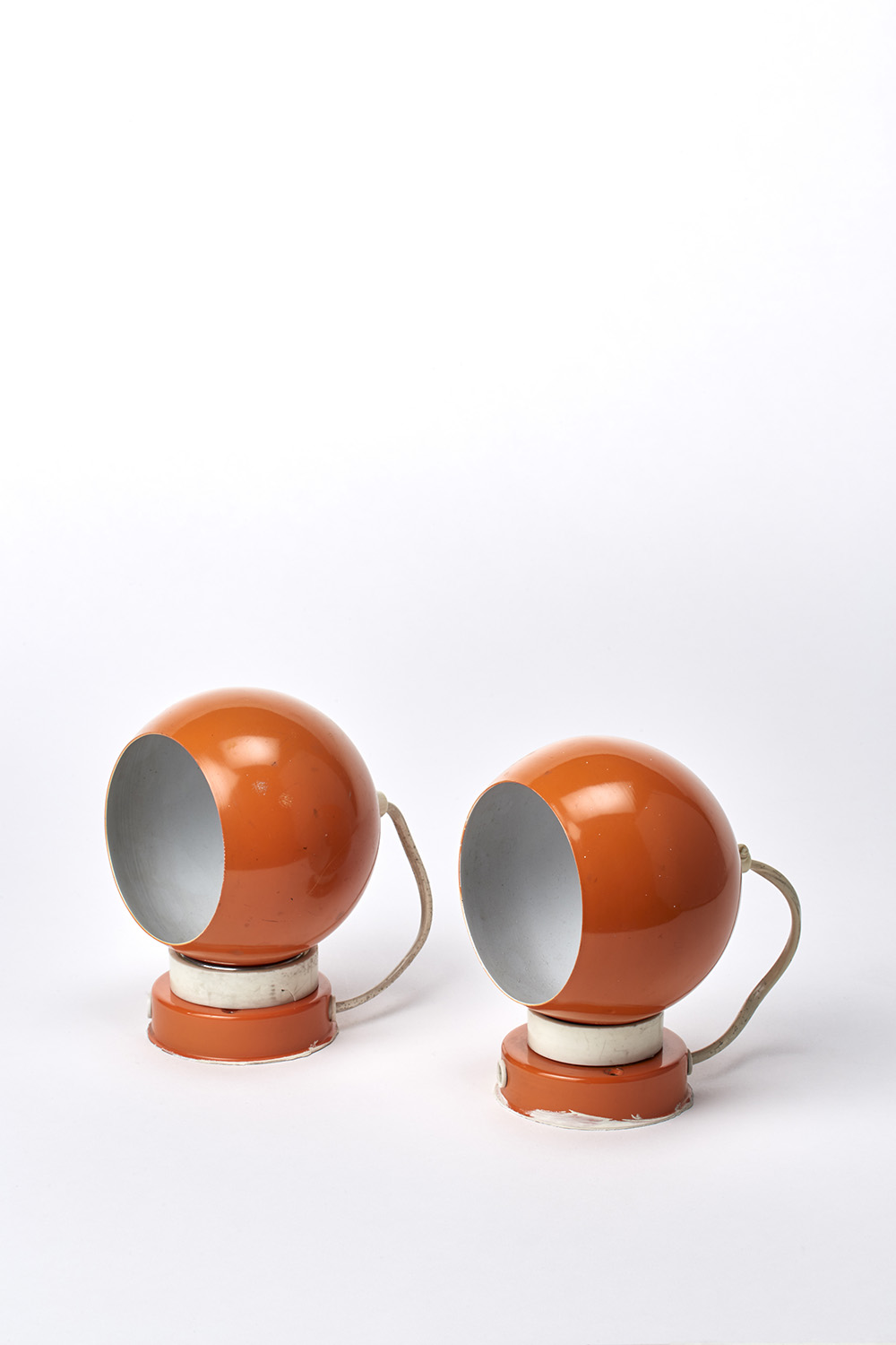 Coppia di abat jour in metallo smaltato arancio con diffusori sferici regolabili mediante magnete. Italia, anni '70. (h cm 15,5) (difetti)